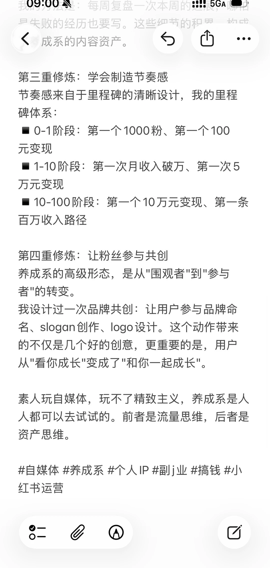 我的方法是:每周复盘一次本周的进展,哪怕是失败的经历也要写。这些细节的积累,构成了养成系的内容资产。