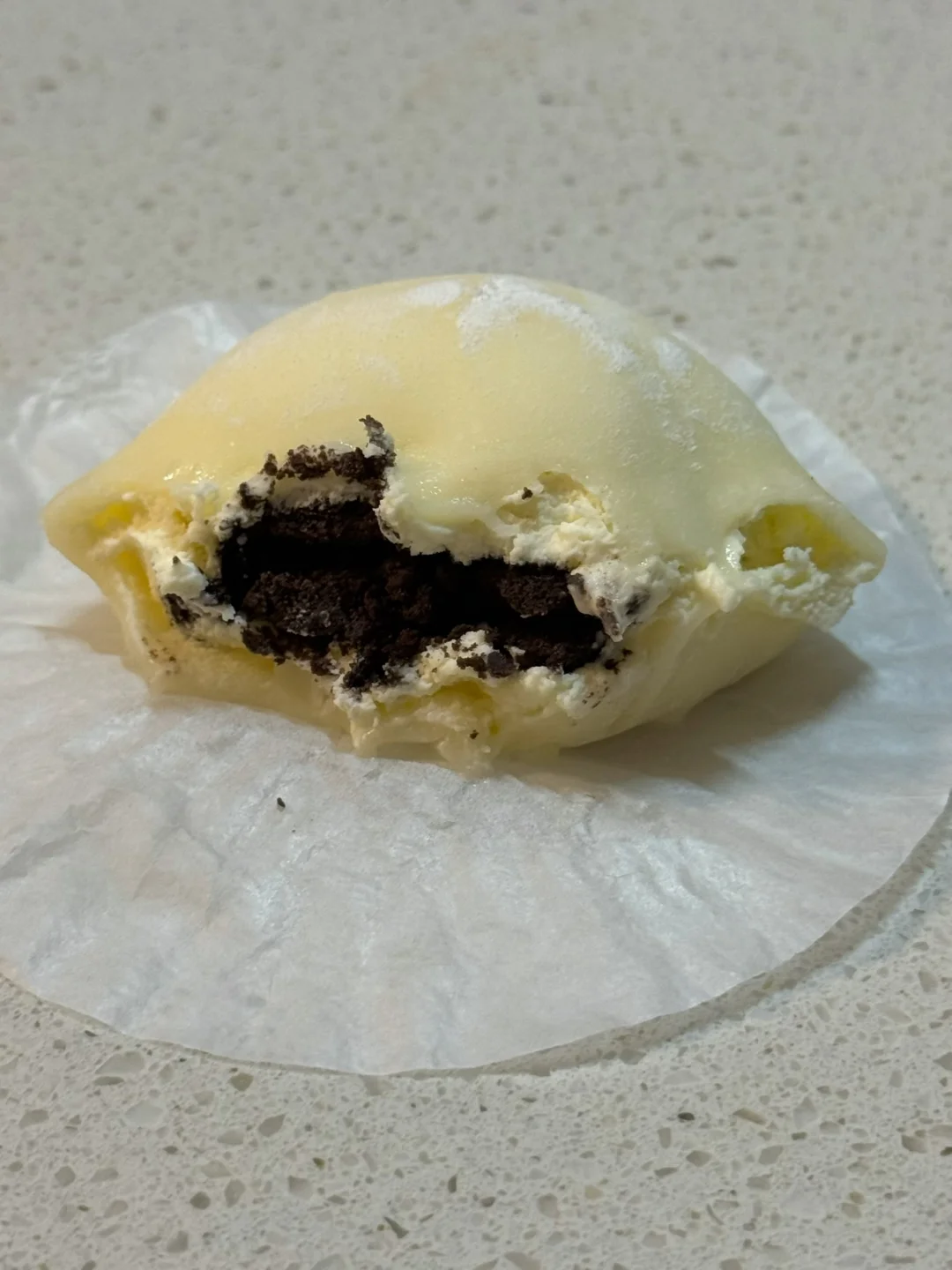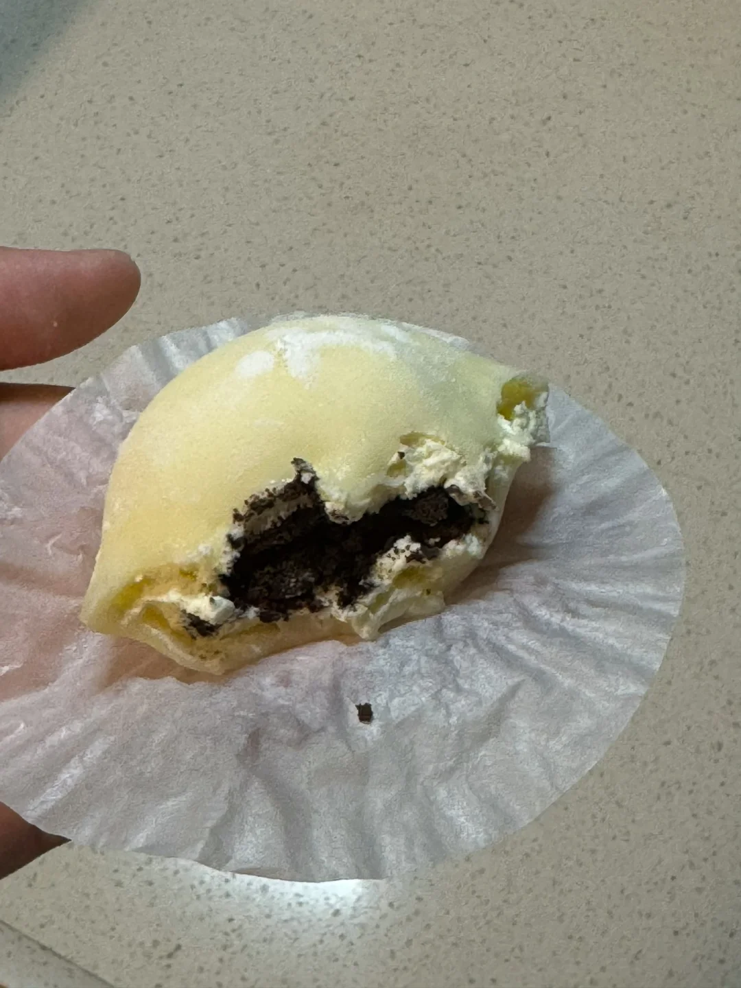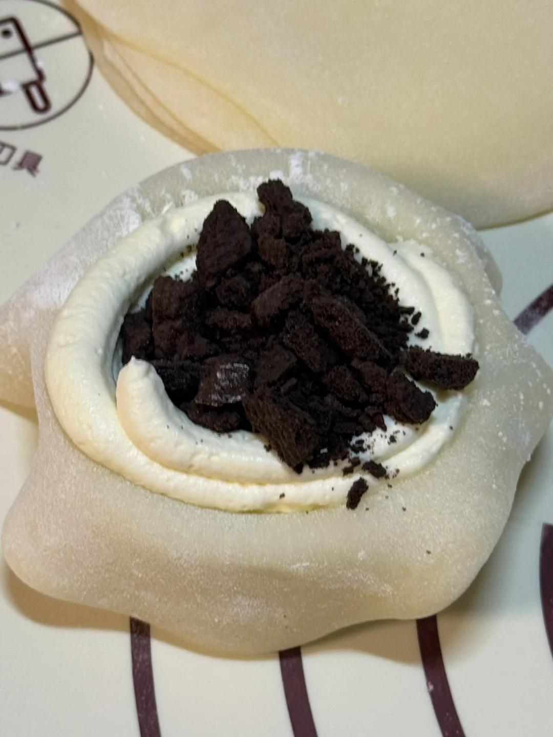 6.擀好的面皮放入模具中,挤上奶油、放入奥利奥碎包包子一样包住,多余的用剪刀剪掉。做好的雪媚娘可以放冰箱冷藏一小时后再享用(也可以放冷冻半小时)口感会更好哦!