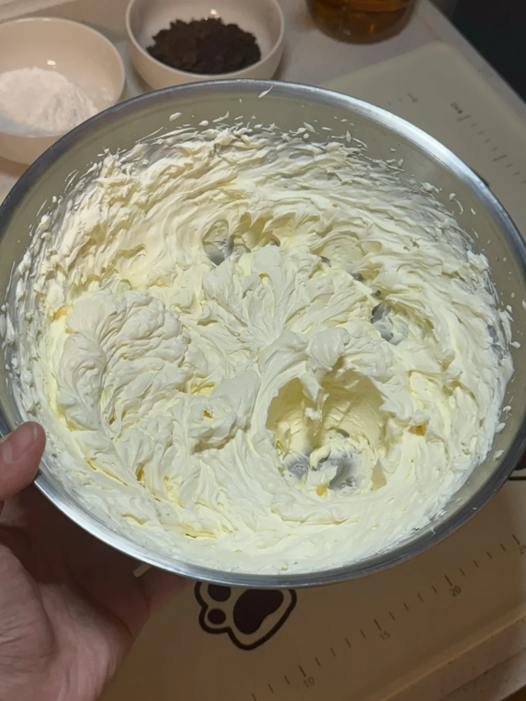 5.奶油350g、细砂糖20g打发至硬挺。