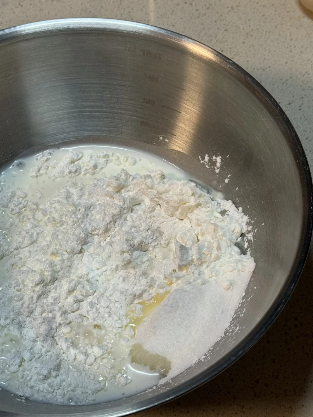 1.糯米粉、细砂糖、玉米淀粉、纯牛奶搅拌均匀。