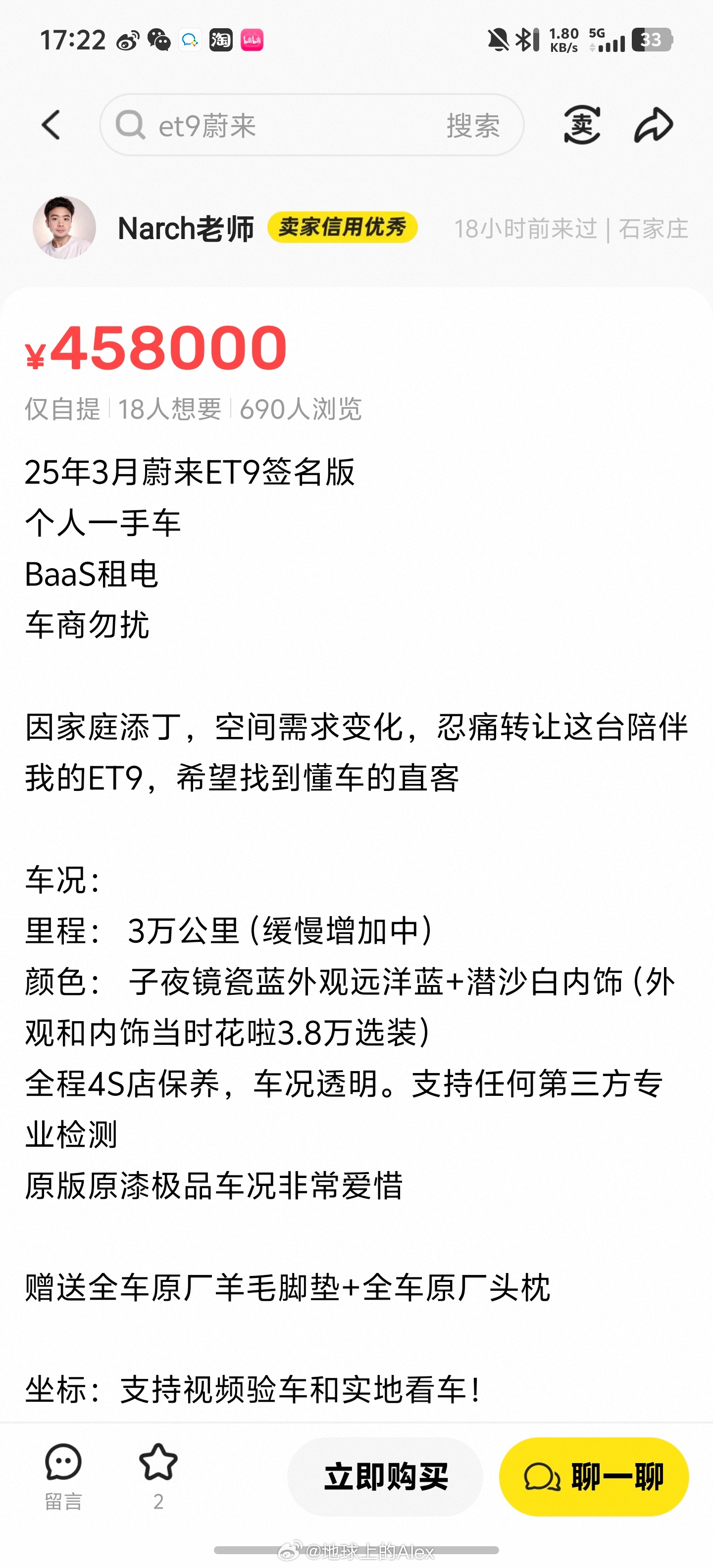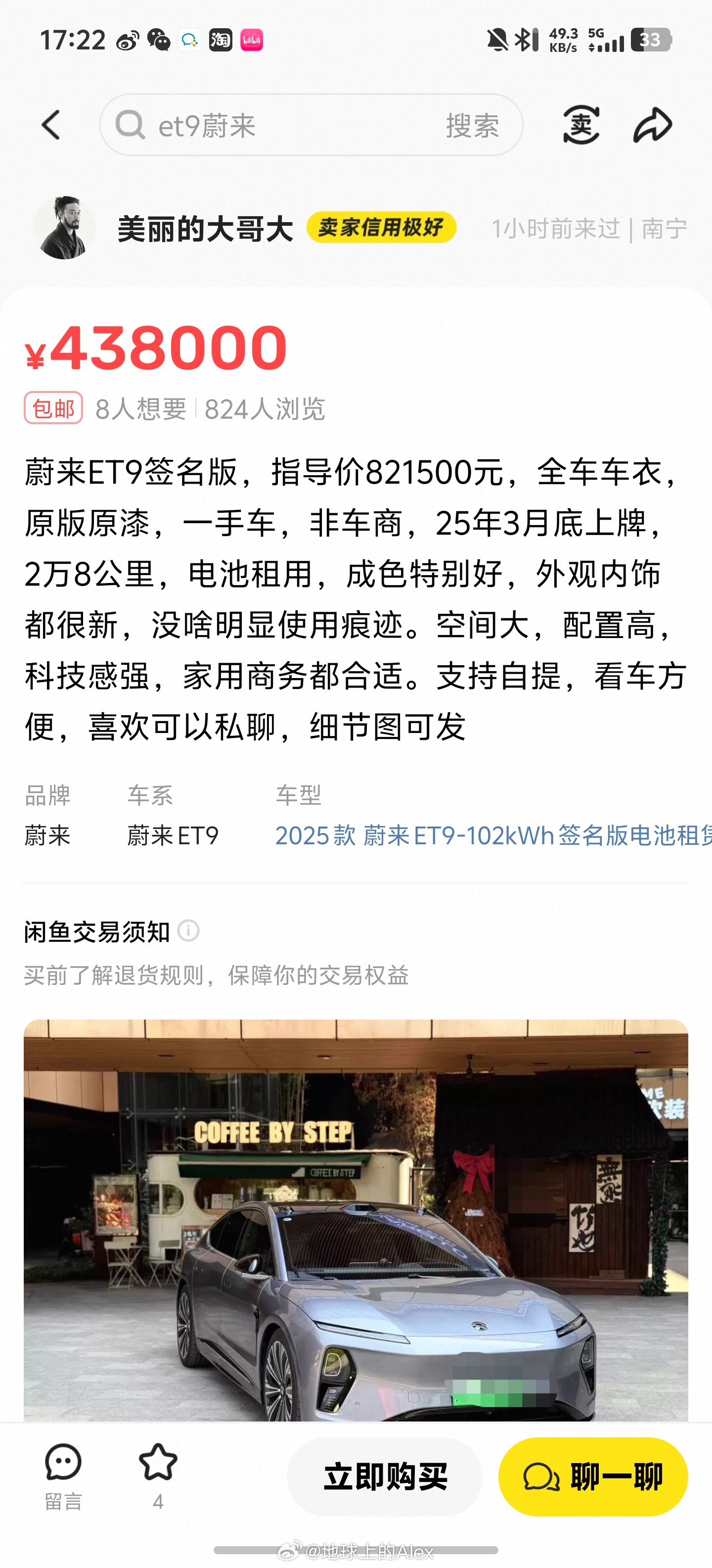 本来当初收ET9就在40-50万,留给自己的利润也就5万块钱上下,每个月还要交1200元的租电钱本来可以卖50万的车,全新车都只要56万了,谁还买二手车啊只能慢慢降价,干到40万左右新收ET9就可想而知了,不收甚至大幅贬值收都有可能,这也是一直在画“蔚来官方二手车”大饼的原因当然,蔚来官方二手车又不是没做过,最后怎样,蔚来老车主应该都懂