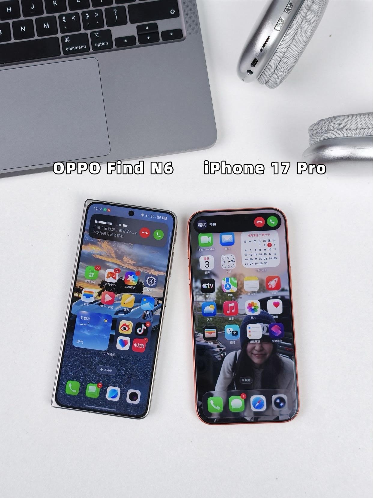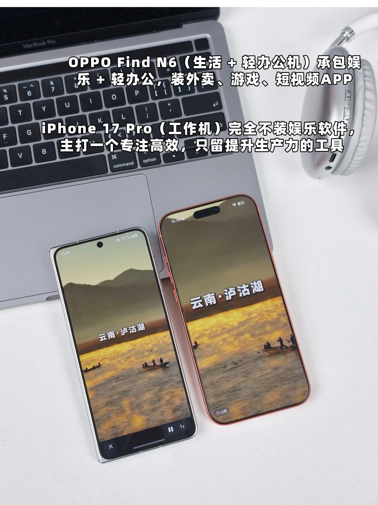 OPPO Find N6+iPhone 17 Pro互补到封神✨ 成年人的双持快乐,是OPPO Find N6和iPhone 17 Pro给的😭 试过很多搭配,最终锁死这两台,分工明确、互联丝滑,完美解决单台手机的所有痛点,工作生活两不误,再也不用在系统和体验之间做选择~ ◼️为什么需要2台手机? 工作与生活勉强分开,但iPhone电池顶不住一天 安卓的折叠大屏、分屏、通话录音、长截图,苹果都没有,双系统互补,效率翻倍。 ◼️ 两台手机分工 ✅ iPhone 17 Pro(工作机)完全不装娱乐软件,主打一个专注高效,只留提升生产力的工具 ——WPS、石墨文档、钉钉、企业微信,还有备忘录、百度网盘存工作资料,A19 Pro芯片流畅度拉满,处理工作文档、收发邮件不卡顿,灵动岛还能实时显示工作提醒,加上iOS的隐私安全性,存客户资料、工作机密特别放心。 ✅ OPPO Find N6(生活 + 轻办公机)承包娱乐 + 轻办公,装外卖、游戏、短视频APP;折叠大屏几乎无折痕,看剧拍照巨香,全景自由窗太香了,分屏、小窗切换丝滑,辅助办公时能一边看参考资料、一边编辑文档,AI手写笔还能随手批注、画流程图,效率直接翻倍 ◼️ 互联体验完全不麻烦!快传传文件 / 照片秒速搞定,消息可同步,跨屏调用文件丝滑;Find N6弥补iPhone续航、通话录音短板,iPhone撑稳定性,互补拉满。 不用在系统之间妥协,不用为了功能取舍,工作归工作、生活归生活,这种互不打扰、互相成就的双持体验,真的是成年人最踏实的自由✨