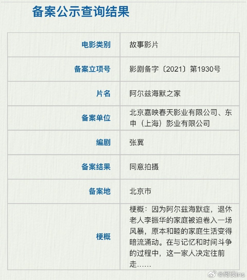陈可辛新片4月成都开机按网传就是电影《阿尔茨海默之家》 主演:周迅编剧:张冀(《亲爱的》、《中国合伙人》)梗概:讲述国内中年人早发性阿尔茨海默病这一群体的种种病状和生活中真实的困境。 因为阿尔兹海默症,退休老人李振华的家庭被迫卷入一场风暴,原本和睦的家庭生活变得暗流涌动。在与记忆和时间斗争的过程中,这一家人决定往前走……