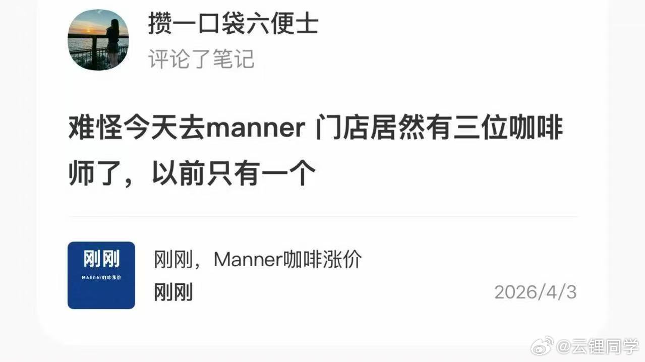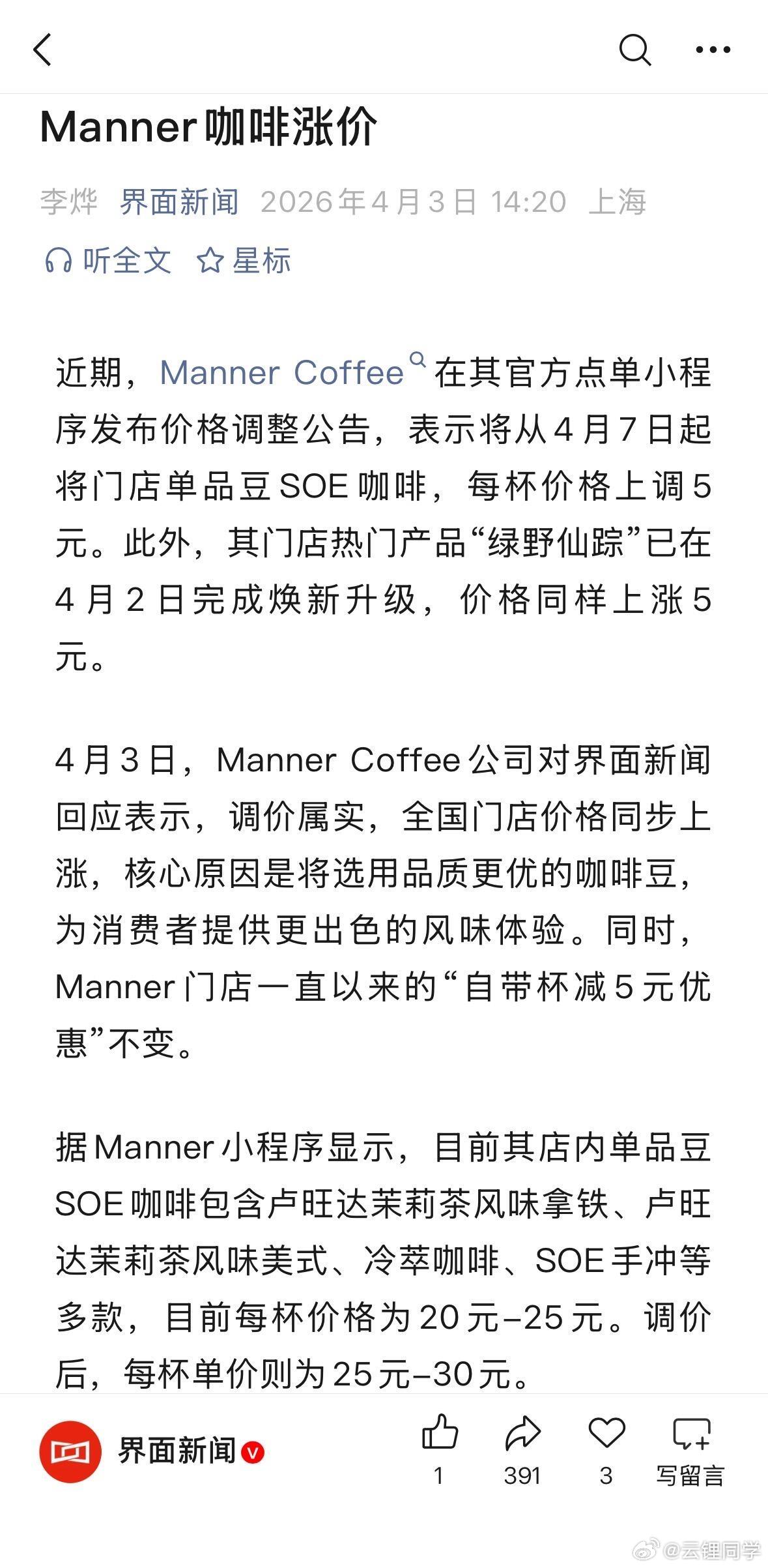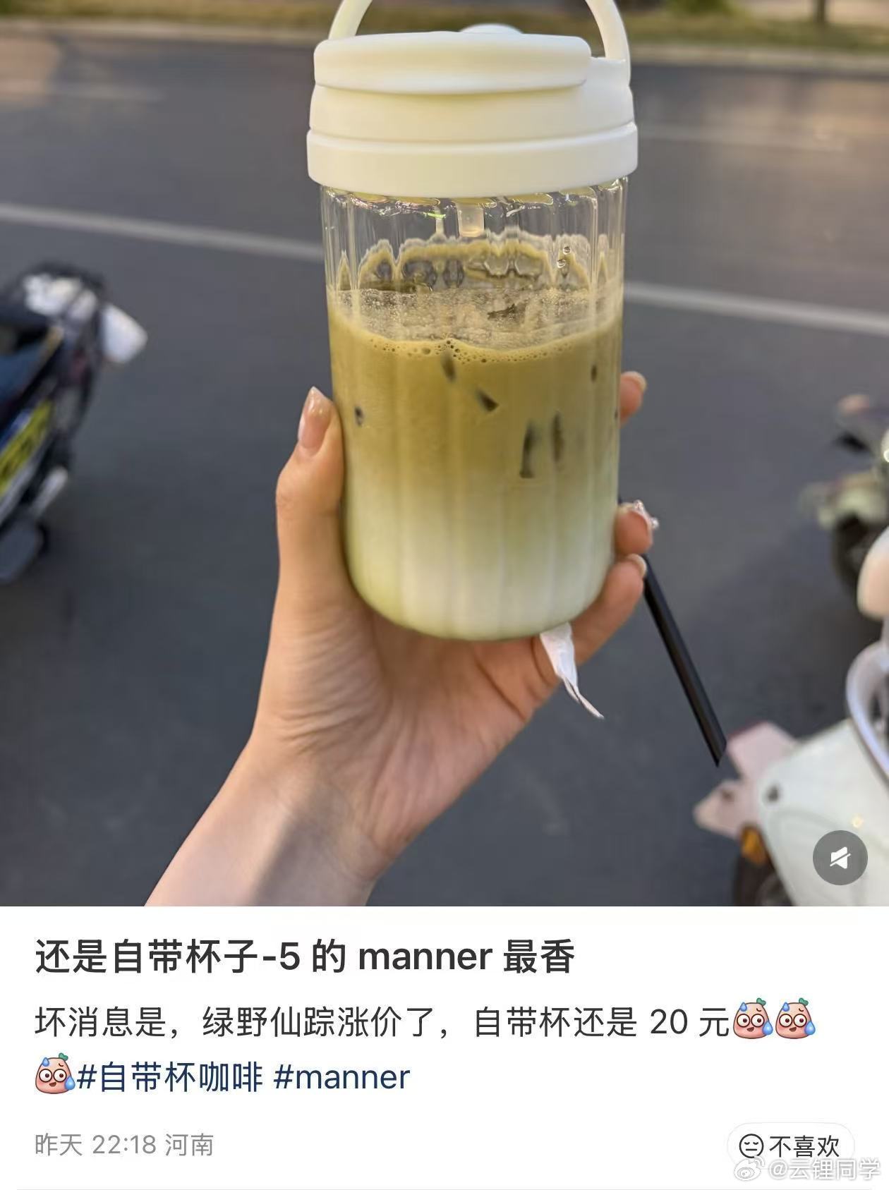 Manner涨价原因 很简单,就是选用了更高品质的咖啡豆。而且不要被涨价两个字吓到,只有SOE咖啡类目和「绿野仙踪」涨价,其他饮品价格没变。另外,Manner门店一直以来的“自带杯减5元优惠”传统也没变。