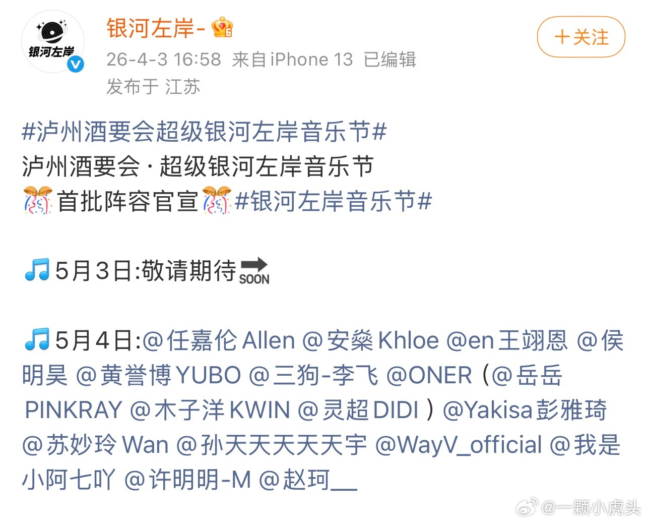 任嘉伦官宣银河左岸音乐节,5月4日期待嘉伦新舞台👏