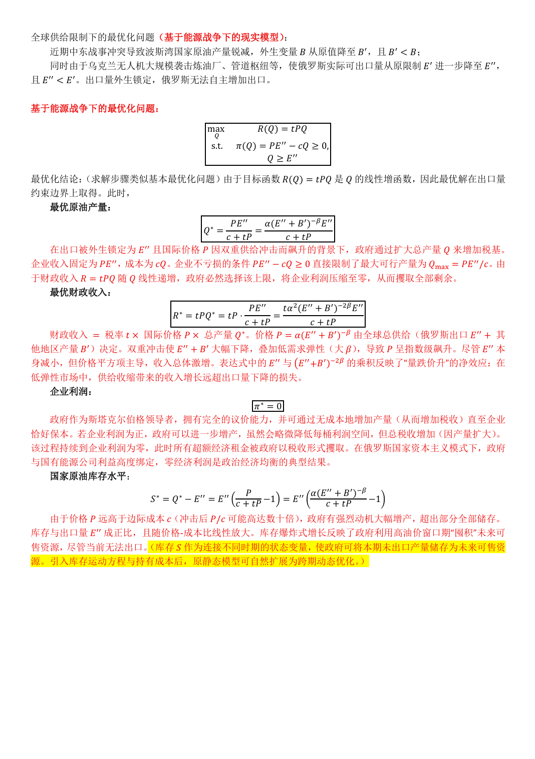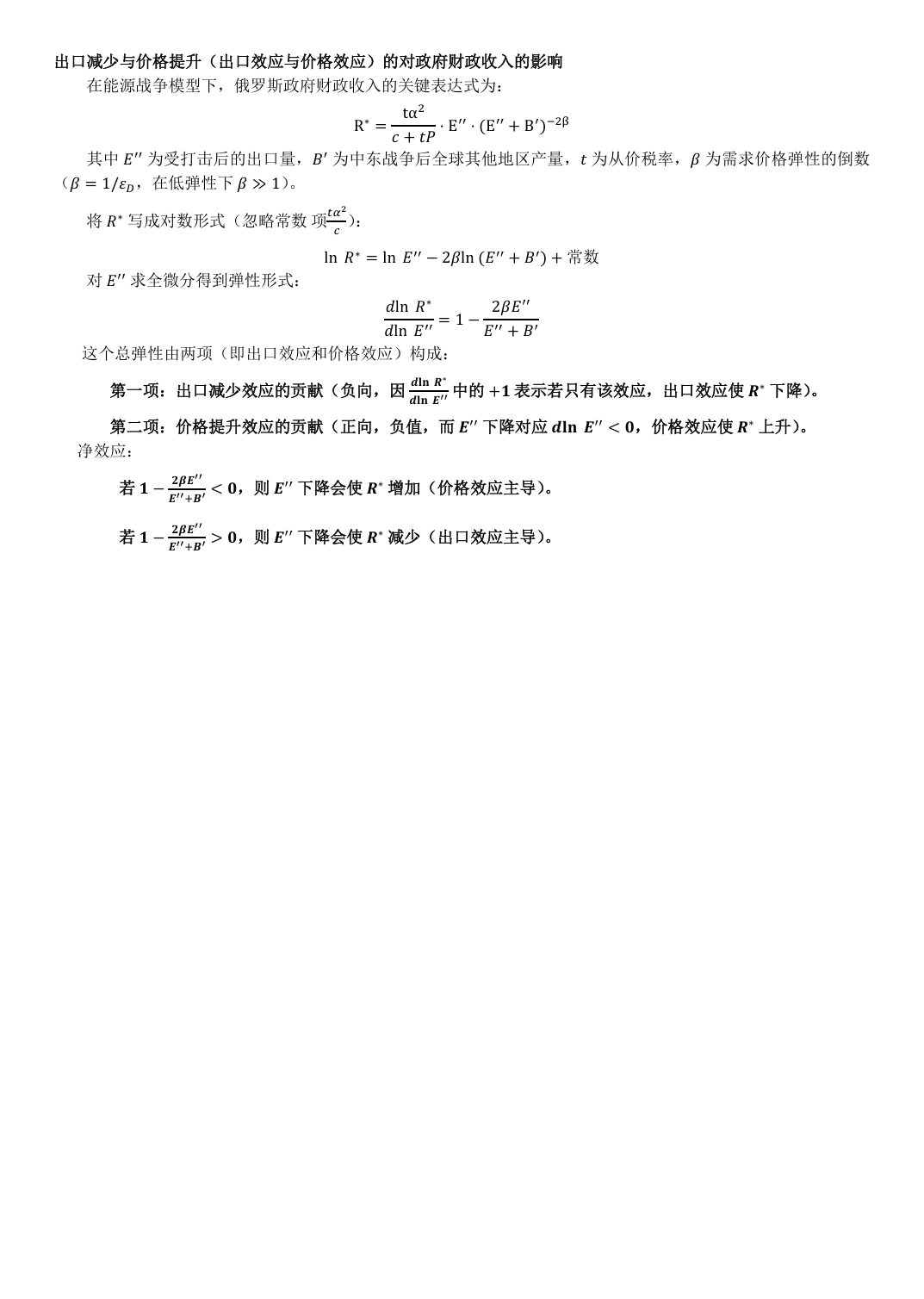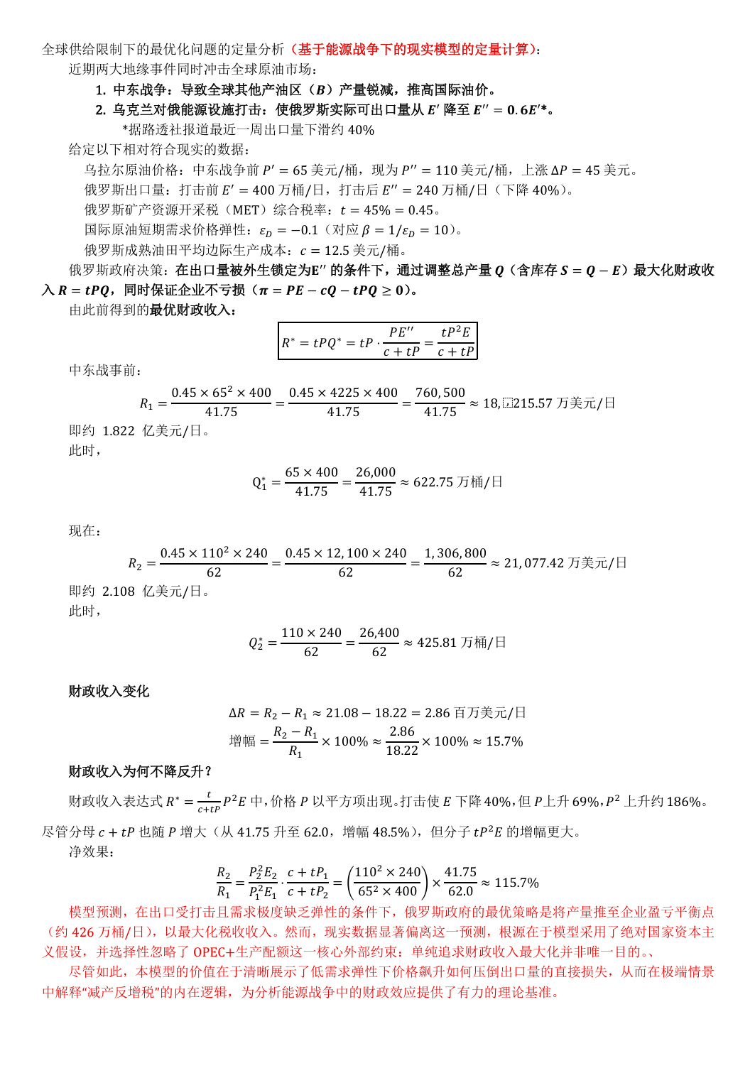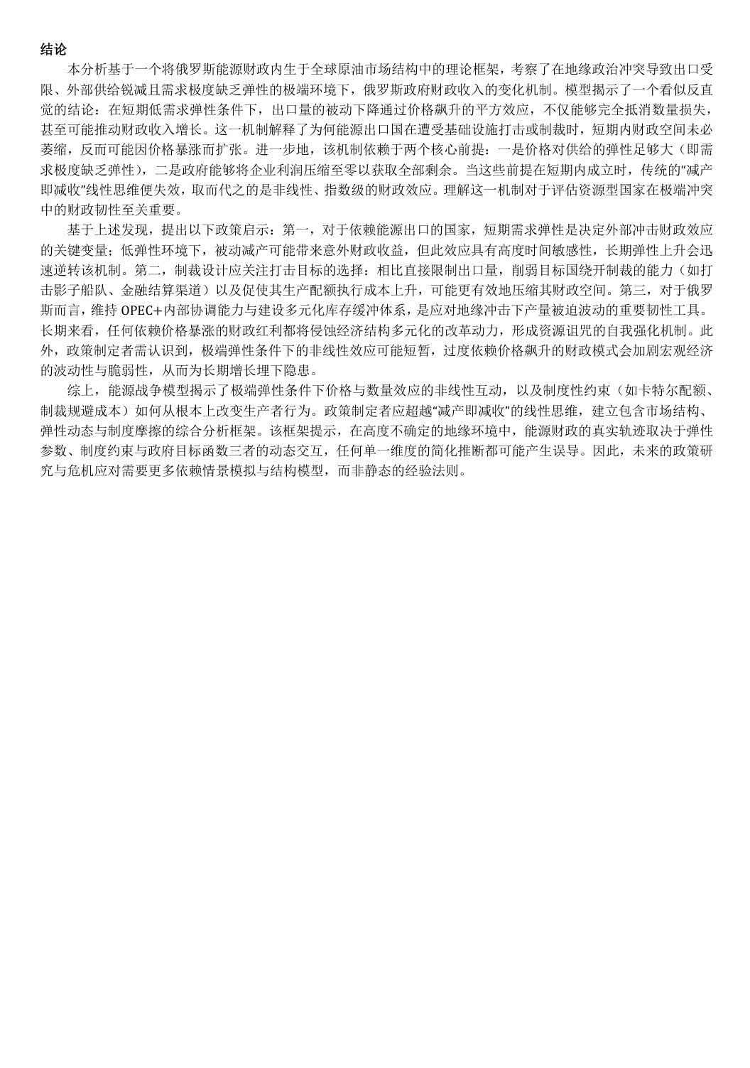 需要坦诚指出,本文模型具有高度的简化性质,其核心目的在于揭示极端弹性条件下的非线性价格与数量效应,而非对复杂现实进行完整复刻。具体而言,模型忽略了若干在实际政策运行中不可忽视的重要因素,包括:能源企业的再投资需求(长期产能维持所必需)、俄罗斯国内原油消费对出口可售量的挤占、全球能源市场中多源买家与差异化定价的现实结构,以及近年来愈发重要的“影子船队”等制裁规避渠道。这些因素均可能显著影响政府与企业之间的剩余分配、实际出口弹性和财政韧性,本文暂将其置于模型之外,以便聚焦于基本机制的讨论。