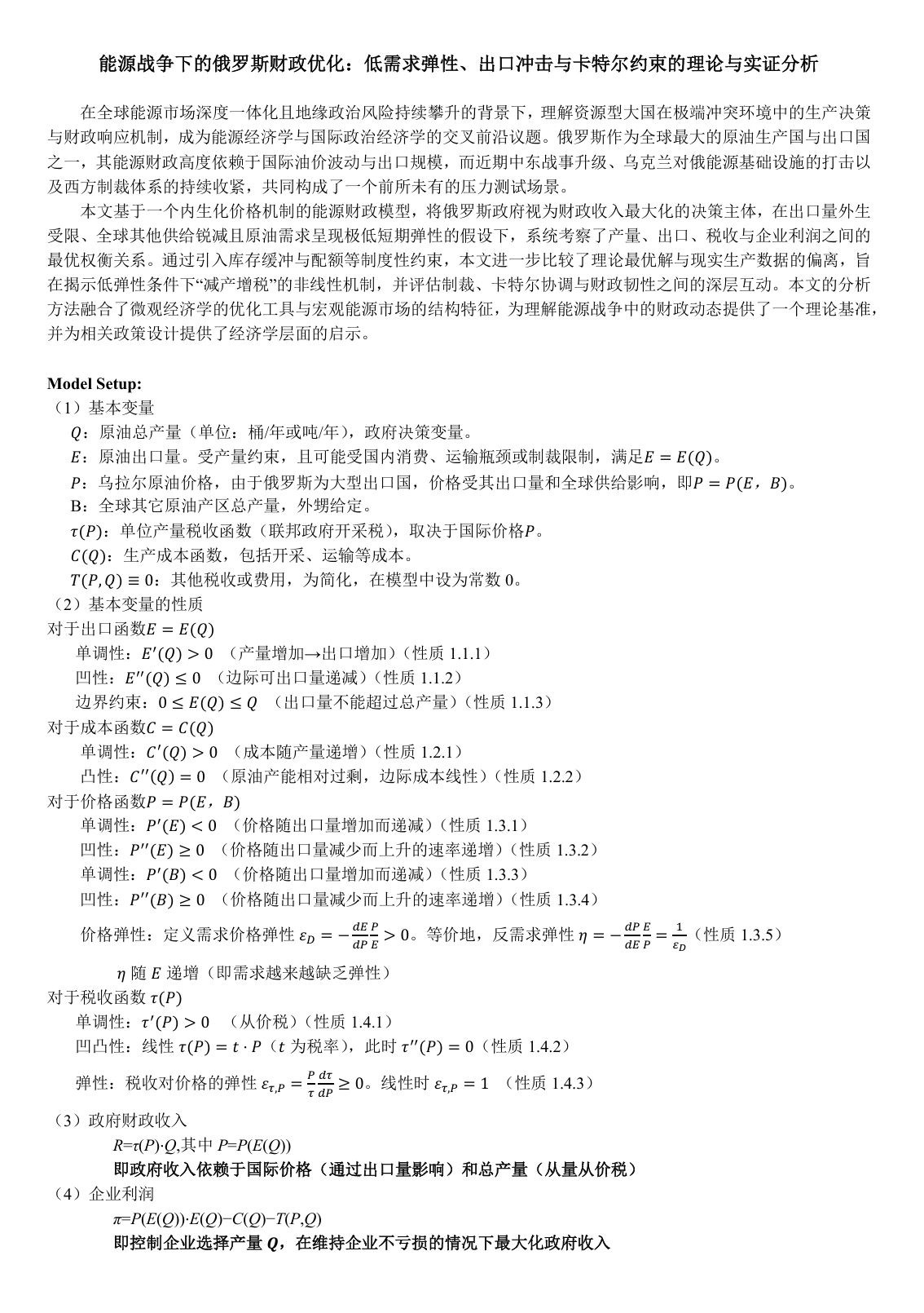 因此,当前静态模型所揭示的价格飙升与财政增长效应,在跨期动态框架下可能会被削弱或逆转——企业若预期未来价格回落,其再投资激励的变化、政府库存持有成本的引入、以及多期财政平滑目标,都将深刻改变最优生产与出口决策。一个自然的扩展方向是建立包含库存运动方程、跨期预算约束与预期价格路径的动态最优化模型,以考察在“短期打击—中期恢复—长期结构变化”的多层时间尺度下,能源财政的真实演化轨迹。本文的简化模型可视为此类动态研究的理论起点,后续工作将在本文基础上引入时间维度与不确定性冲击,以更贴近能源战争的现实复杂性。