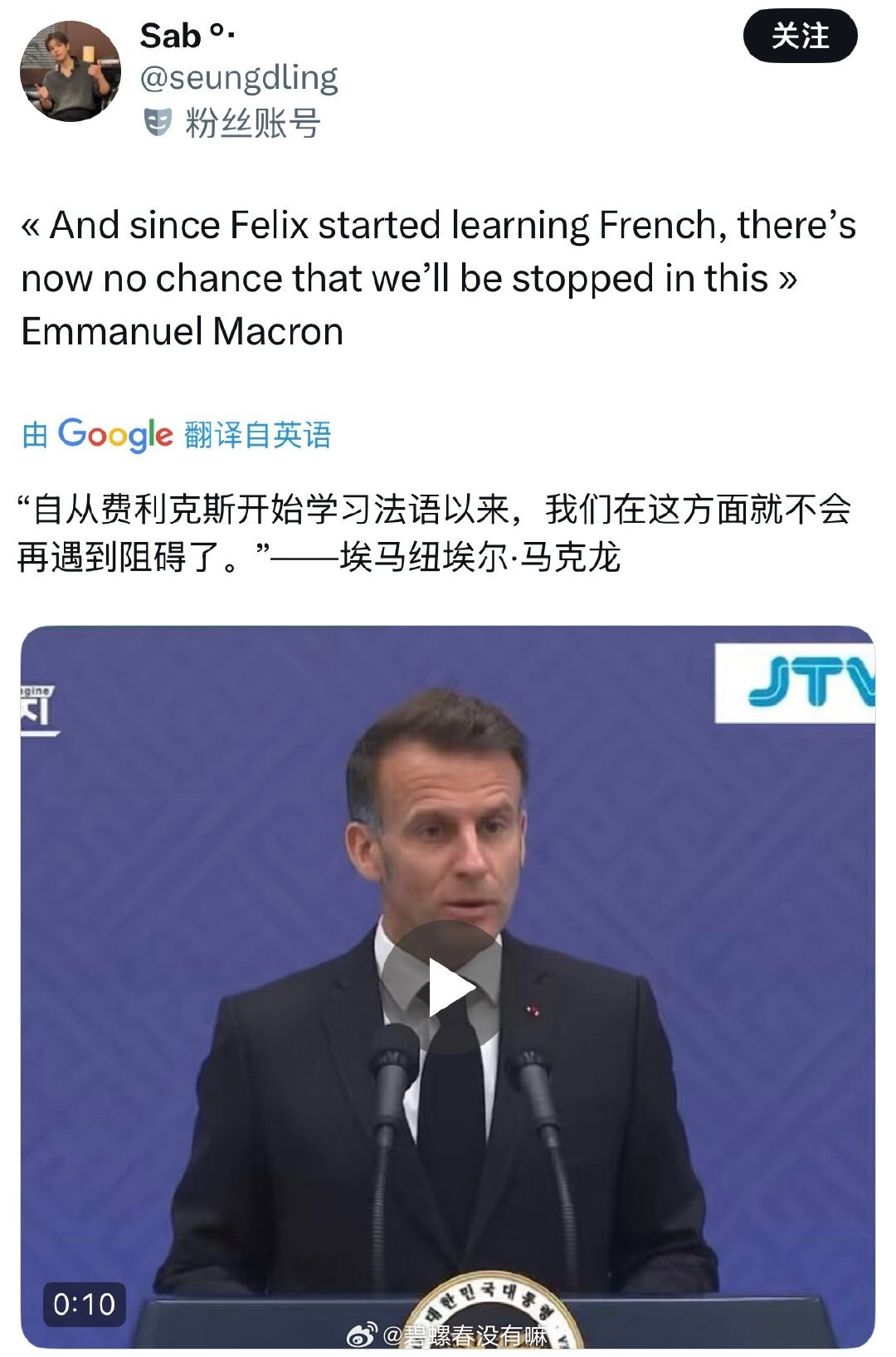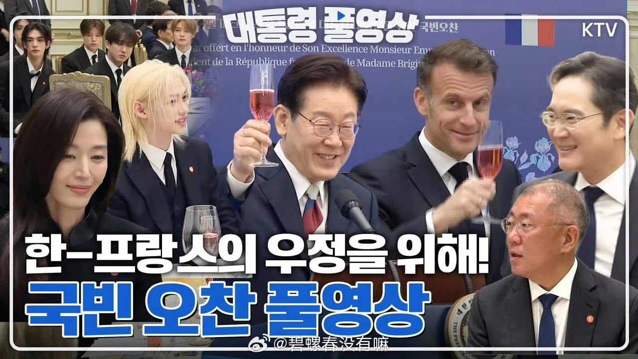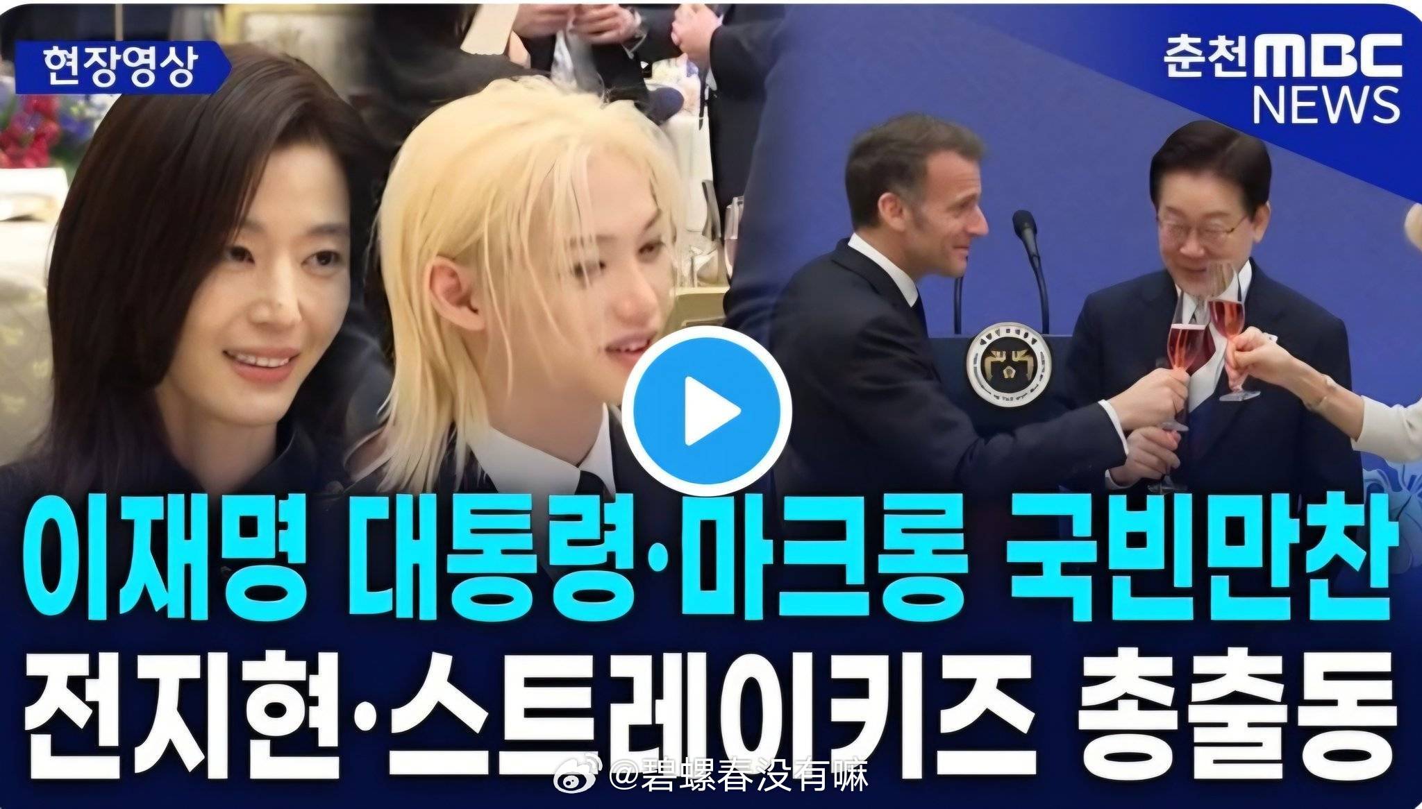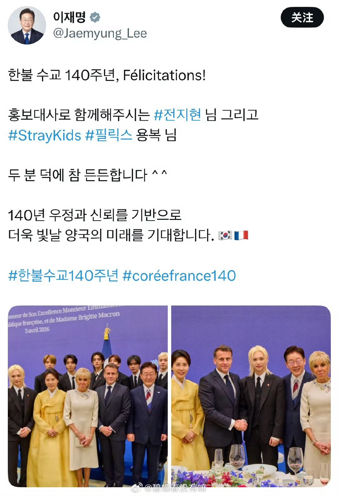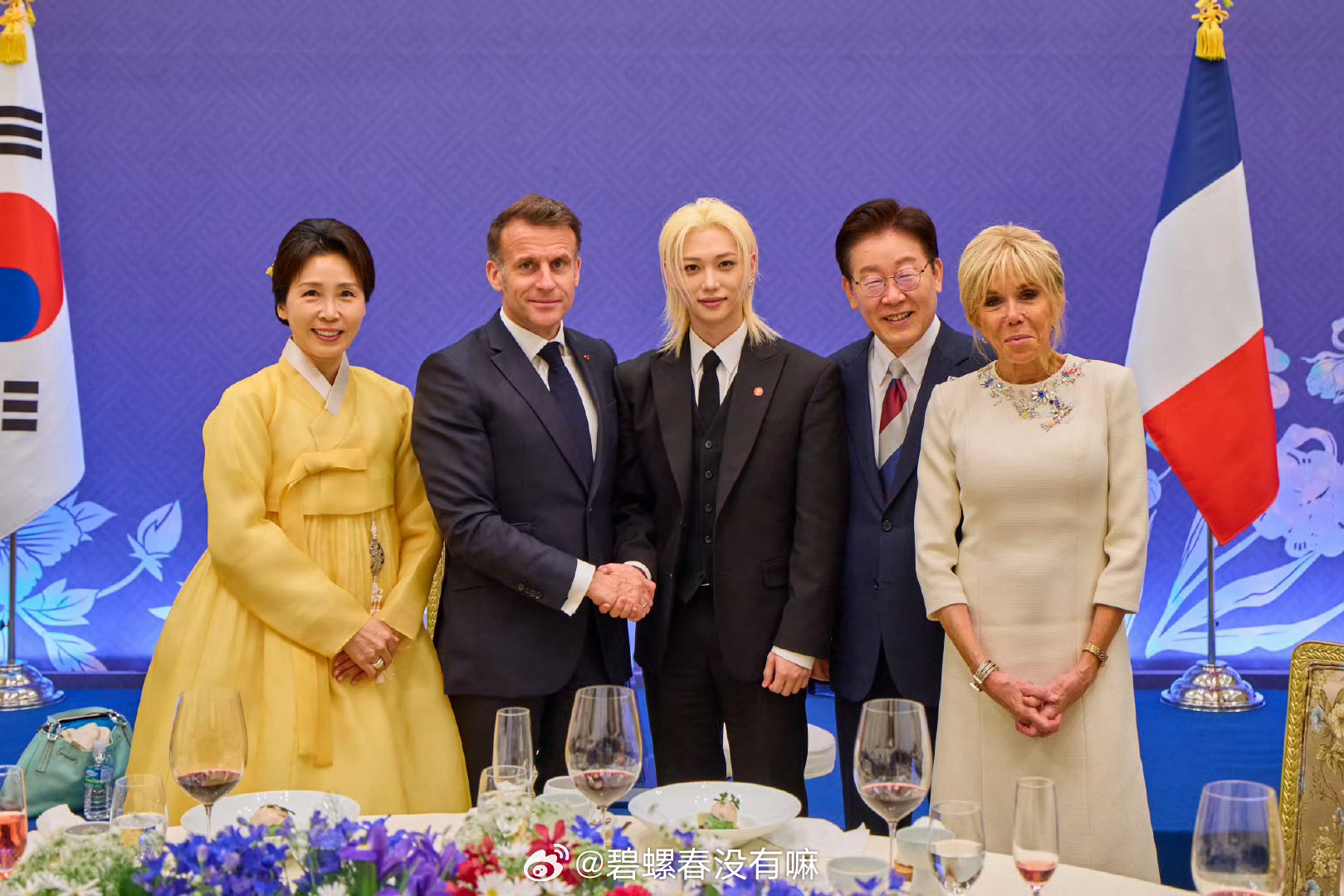 今日Felix李龙馥带以韩法建交140周年纪念名誉大使身份,带着队友们一起出席韩法首脑会谈国宾午宴个人与双方总统及夫人站C位合影🈶与全智贤一起媒体超大封面版头报道🈶被马克龙单独夸赞并献上飞吻🈶让我们一起对李龙馥取得的荣誉进行称赞并谢谢李龙馥