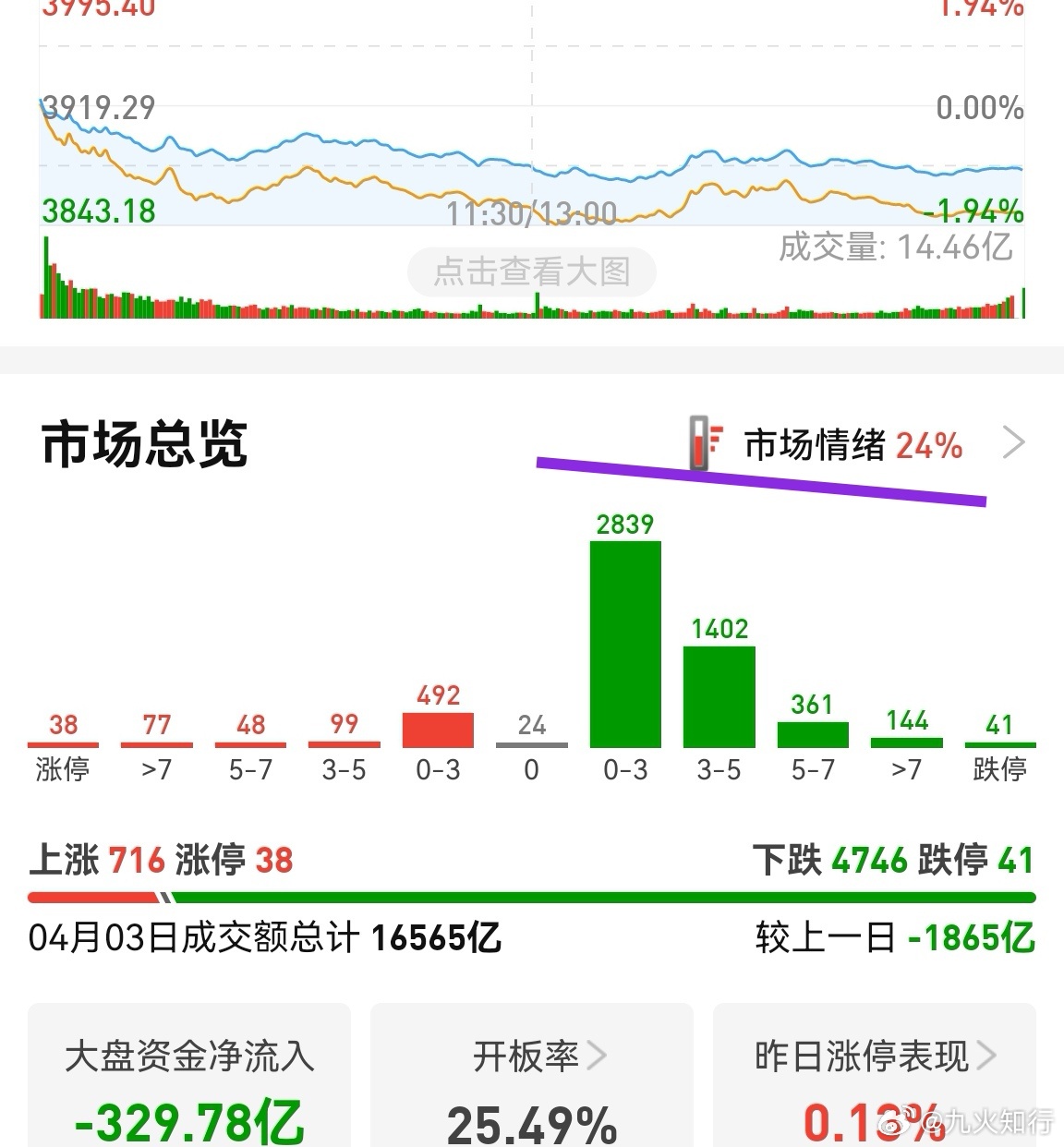 今天市场情绪只有20%多,一般大于50%时,赚钱才容易,属于涨多跌少情况。