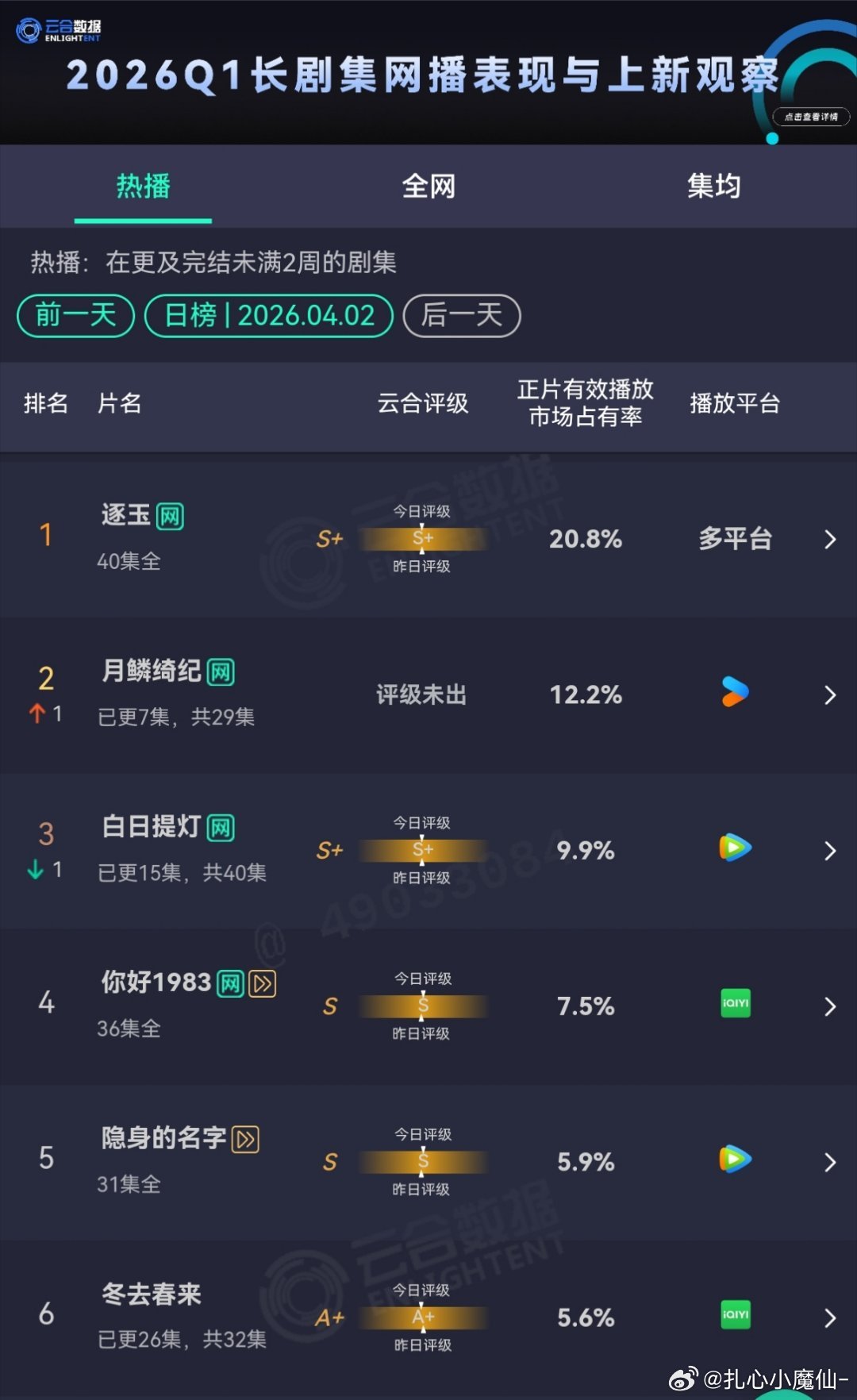 4.2云合 市占率逐玉, 20.8%月鳞绮纪,12.2%白日提灯,