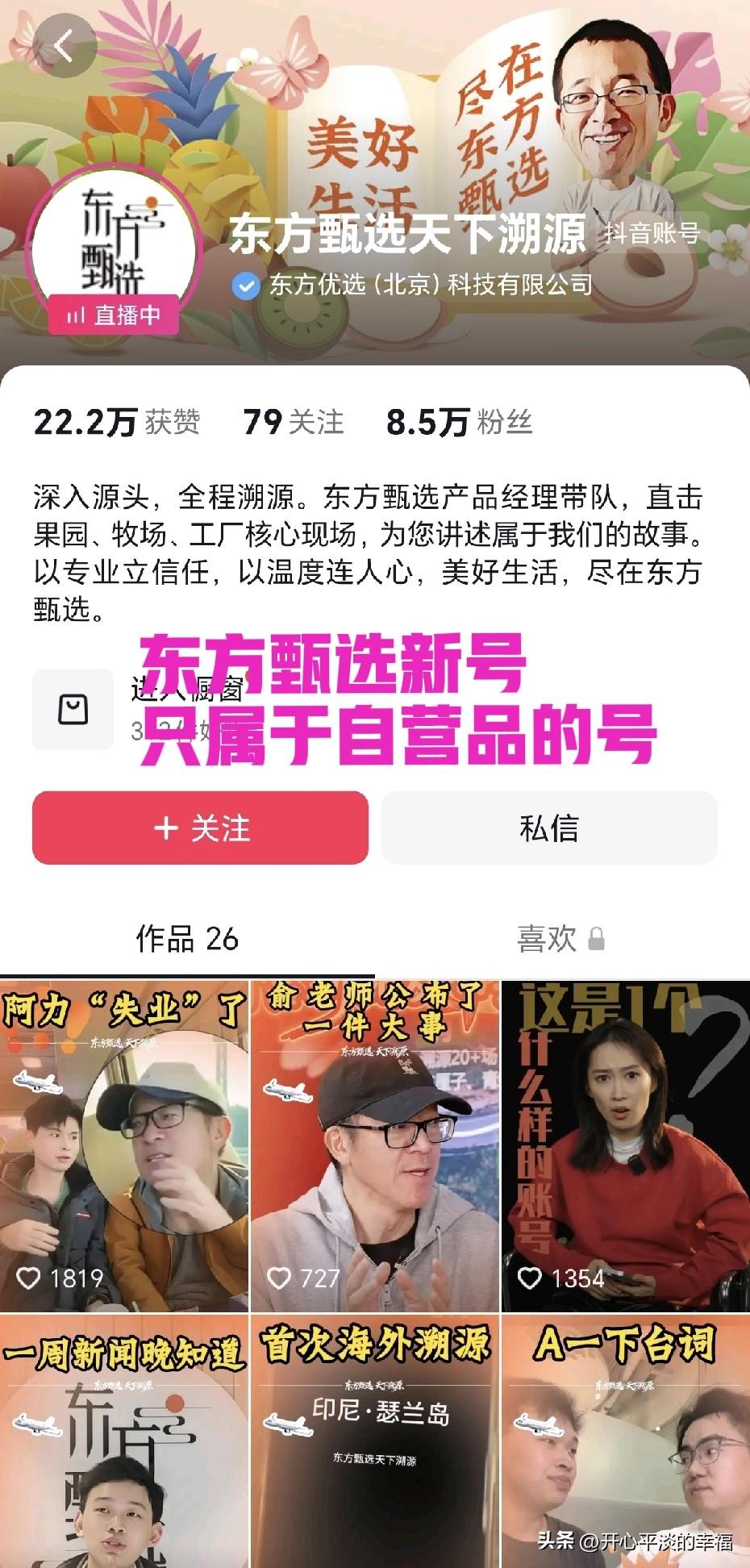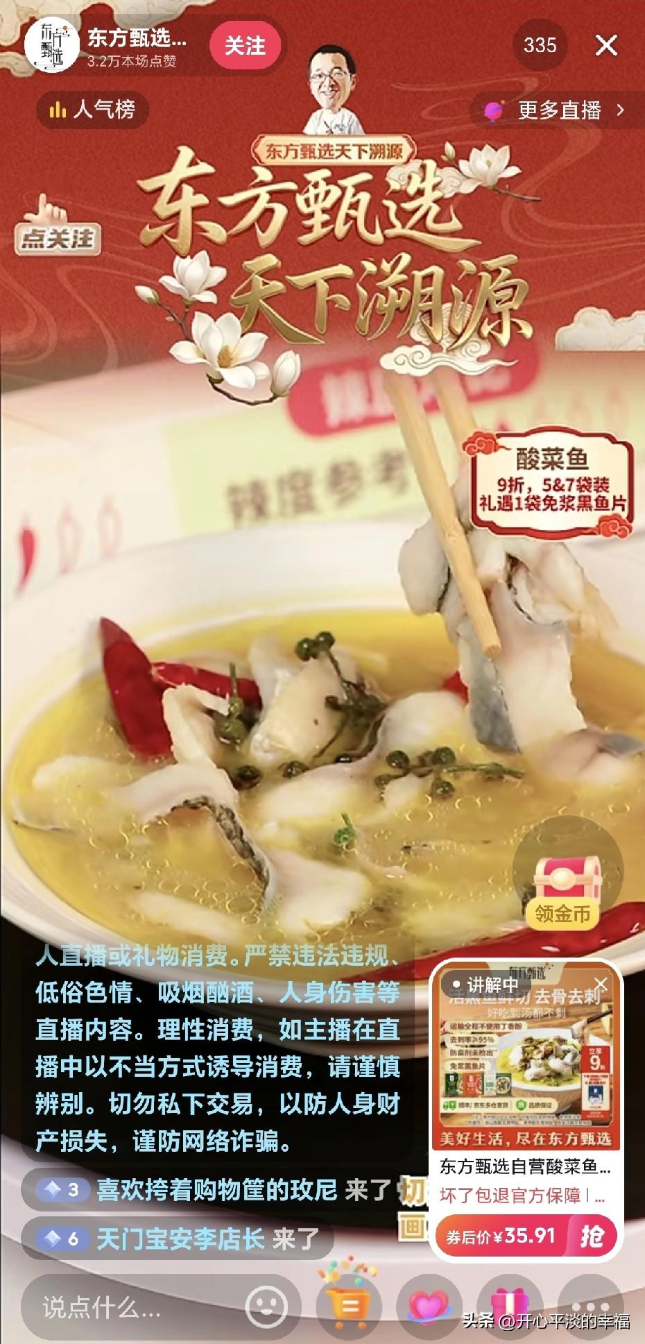 东方甄选自营品不是推荐而是自产,买了几年东方甄选自营品,没踩过坑。 东方甄选又开新号了,是只属于自营品的新号,溯源遍布各地,直击核心现场。以专业连信任,以温度连人心!说的太好了。 刷金币刷到了我最爱的酸菜鱼,对是复购多次的东方甄选自营酸菜鱼,我一个人就能吃一份,搭上两碗米饭,那汁我都能当汤喝了。 金币看完实在没忍住,走进了直播间,好家伙咋只有300多人呀?错了,肯定错了,点开主页,果然是一个新账号,只有8万多粉丝。购物车全是自营品,从头到尾有140多种。 哈哈,东方甄选天下溯源号,没错是“天下”。辽宁丹东的红颜草莓,新疆阿克苏的阿克苏苹果,内蒙古乌兰布和沙漠绿洲的4.20沙漠牛奶,贵州六盘水的刺梨原汁,浙江湖州的蚕丝被,还有来自埃塞俄比亚、巴西的咖啡,泰国的椰子水……