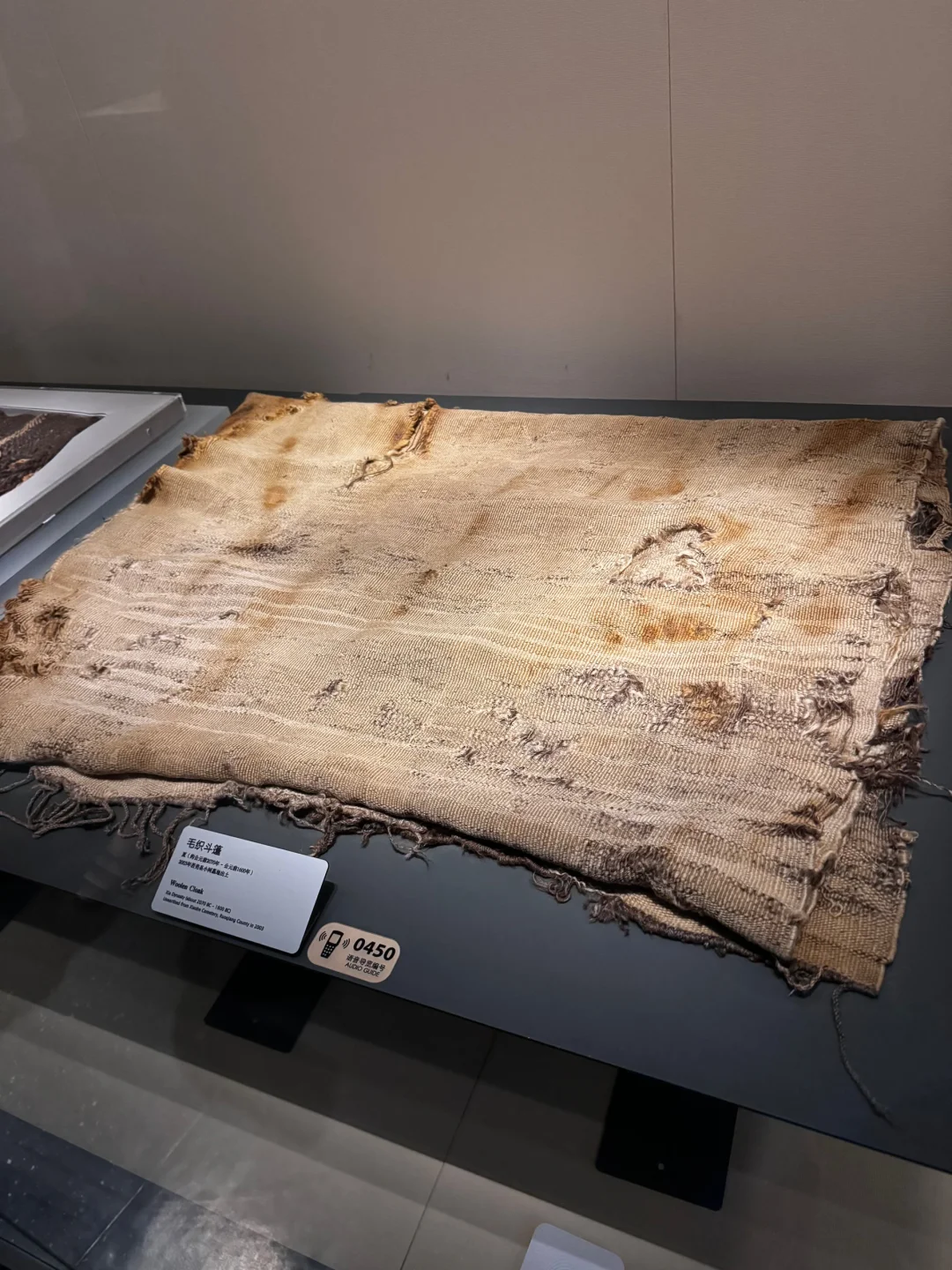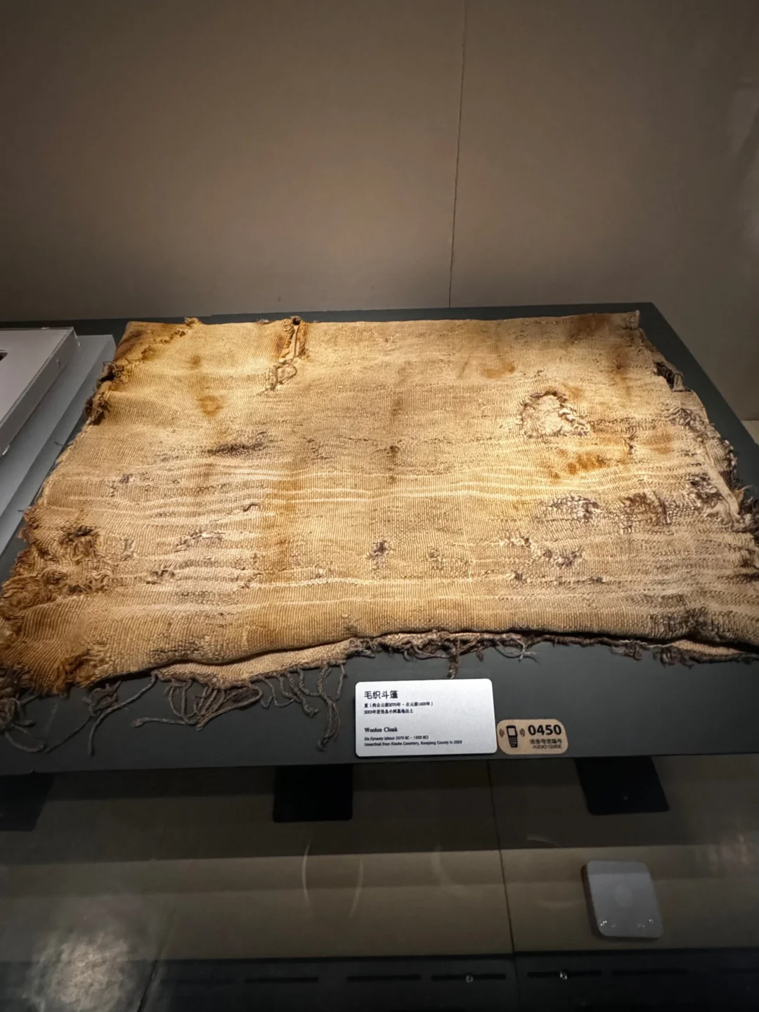 图片拍摄于新疆自治区博物馆,乌鲁木齐 小河墓地出土的毛织斗篷,是中国境内保存最完好、年代最早的完整毛织物,被誉为“四千年前的风衣”。 基本信息 • 出土地:新疆罗布泊小河墓地(孔雀河下游) • 年代:距今约4000—3500年(青铜时代早期,相当于夏商之际) • 材质:纯羊毛(原色:白、灰、浅棕、深棕) • 尺寸:标准长方形,长约1.6米,宽约1.2米 形制与工艺 • 无剪裁、无缝制:整块织成,直接披裹,左侧压右侧,在胸前用木/骨别针固定。 • 织法:平纹编织(最基础、最牢固),经纬线均匀,质地厚实紧密。 • 装饰: ◦ 饰穗:底边用经线结出流苏穗边。 ◦ 红条带:部分斗篷织有红色条纹(底部、中部或纵向),是小河服饰的标志性特征。 ◦ 配色:以羊毛自然色为主,古朴大气,红色点缀显尊贵。 功能与意义 • 实用:防风、保暖、防晒,沙漠环境的“万能外套”,夜晚可当被子。 • 丧葬:几乎所有干尸都用其全身包裹,是重要葬具。 • 文明价值: ◦ 证明4000年前新疆已有成熟毛纺技术。 ◦ 是东西方早期文化交流的物证(羊毛纺织技术可能源自西亚)。 ◦ 中国最早完整毛织品的实物代表。