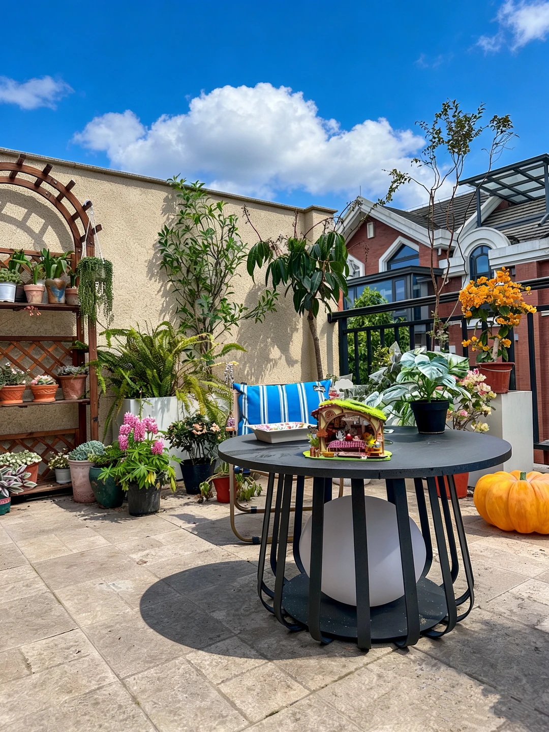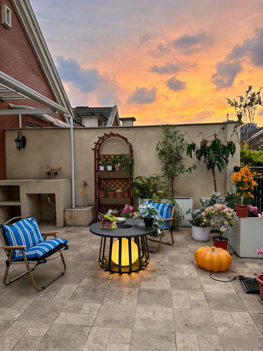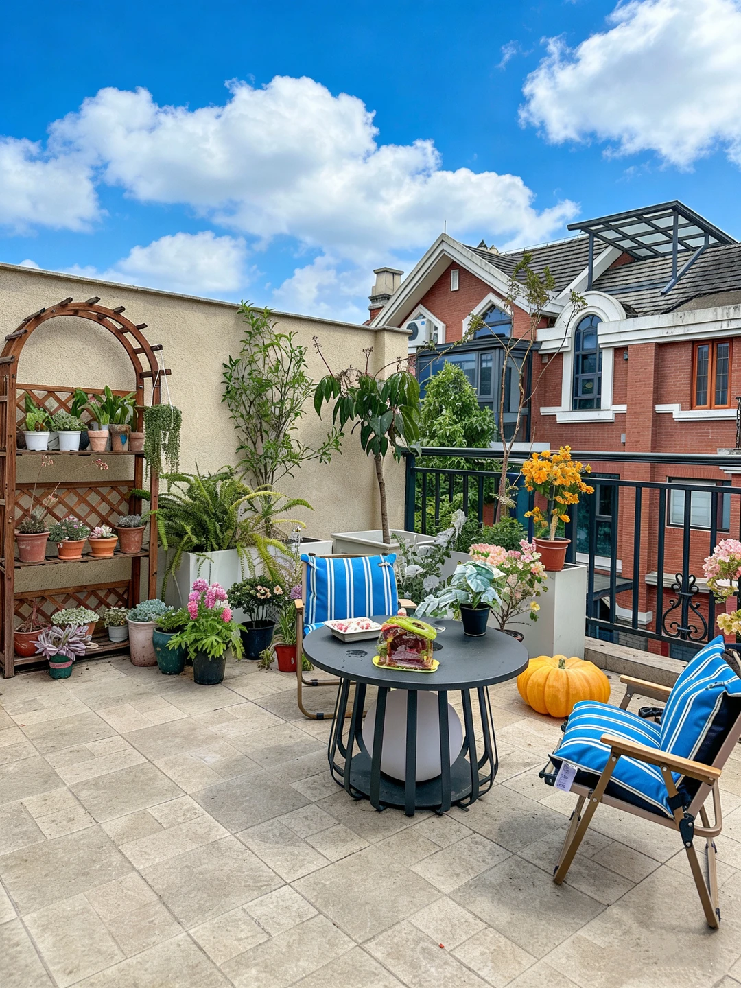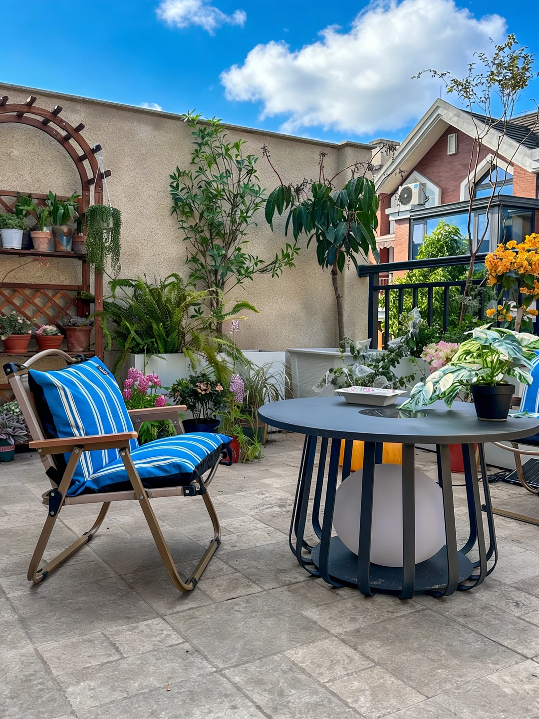 在顶楼露台,终于把心里的那片绿意,都种了出来。 木质花架层层叠叠,养满了我对生活的热爱;绿植高低错落,蕨类的绿意、开花植物的明艳,把这里装点得生机勃勃。 户外桌子自带太阳能月球灯,在蓝天白云下显得格外惬意,夜里就是露台的氛围感担当 累了就坐下来,吹吹风、看看云,感受阳光暖暖地洒在身上。原来,不用去远方,自家的这一方露台,就是治愈一切的良药。