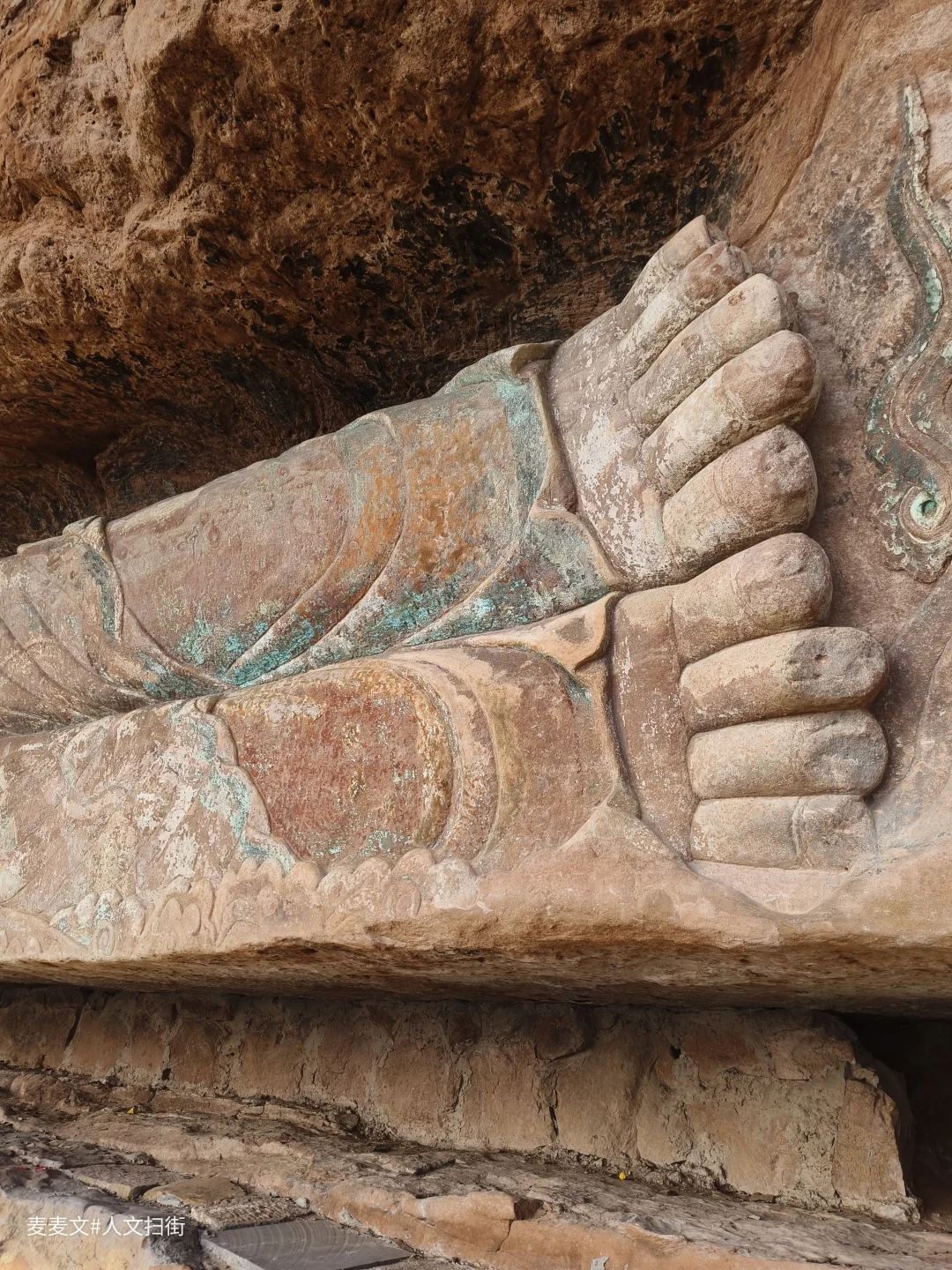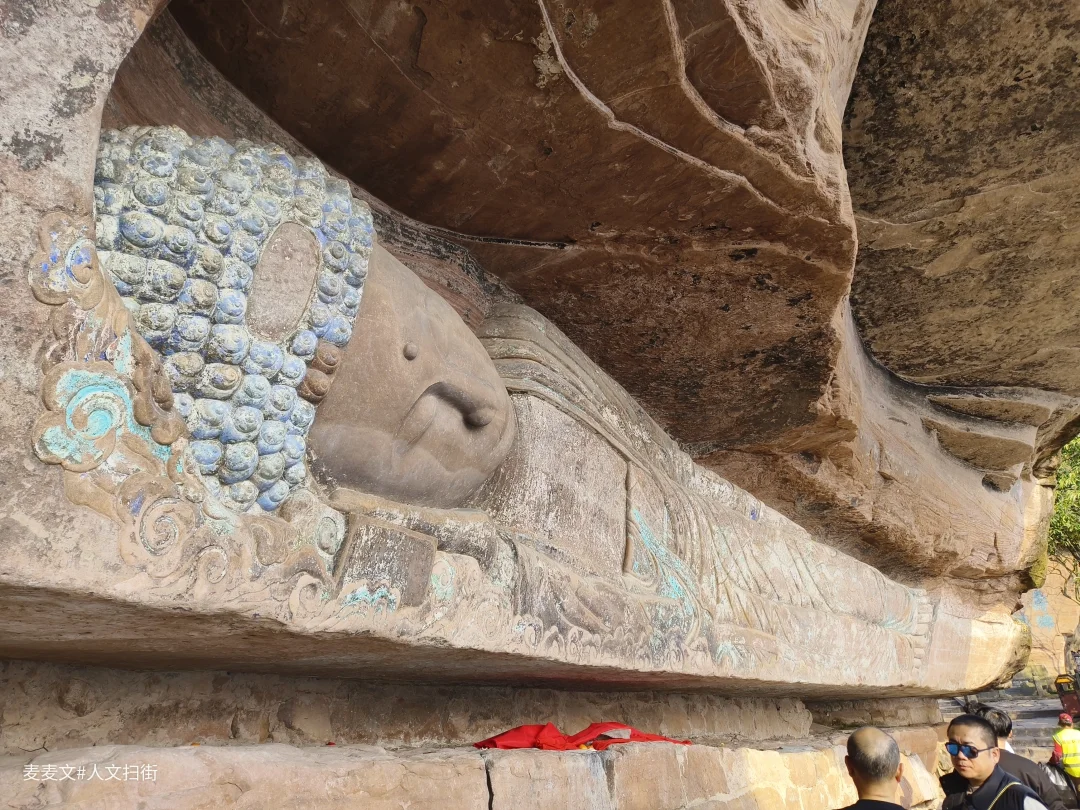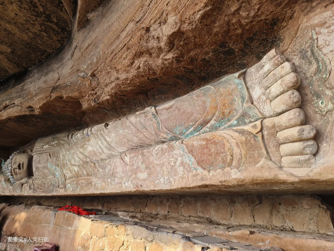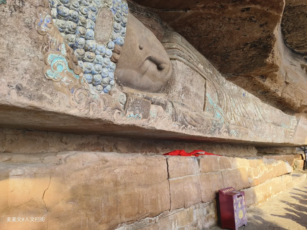 这尊身长11米的晚唐释迦涅槃像,头西脚东横亘崖壁,双领下垂袈裟线条流畅,面形丰满端庄。最绝的是它身下贯通崖壁的深缝,整尊造像凭虚而卧,仿佛佛祖涅槃后升腾欲去,动感十足。