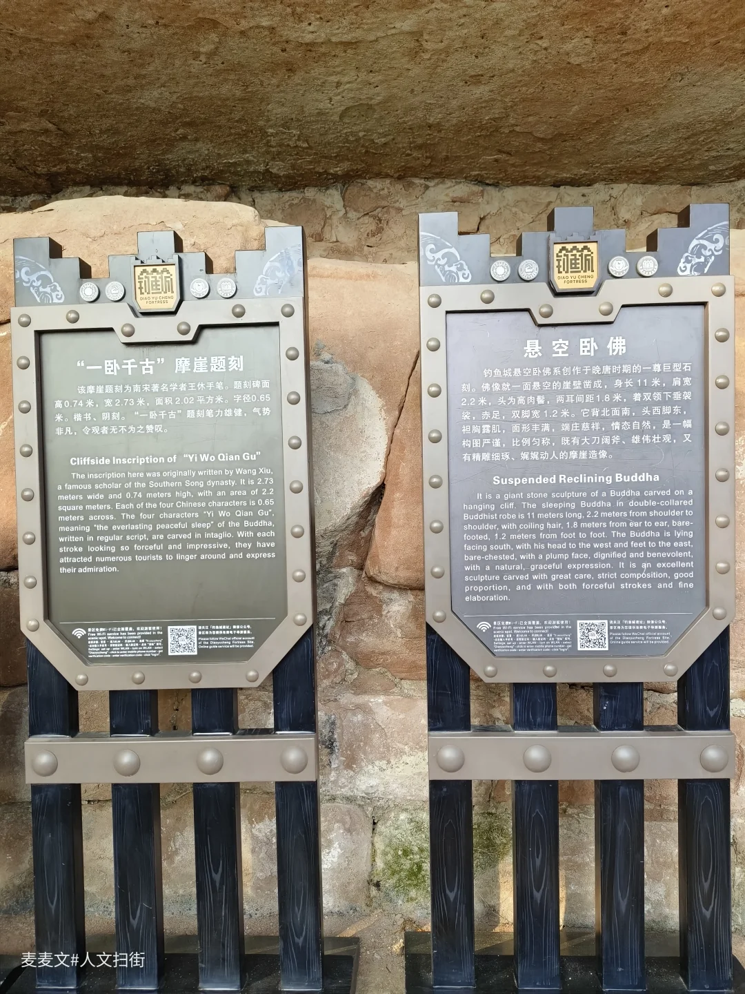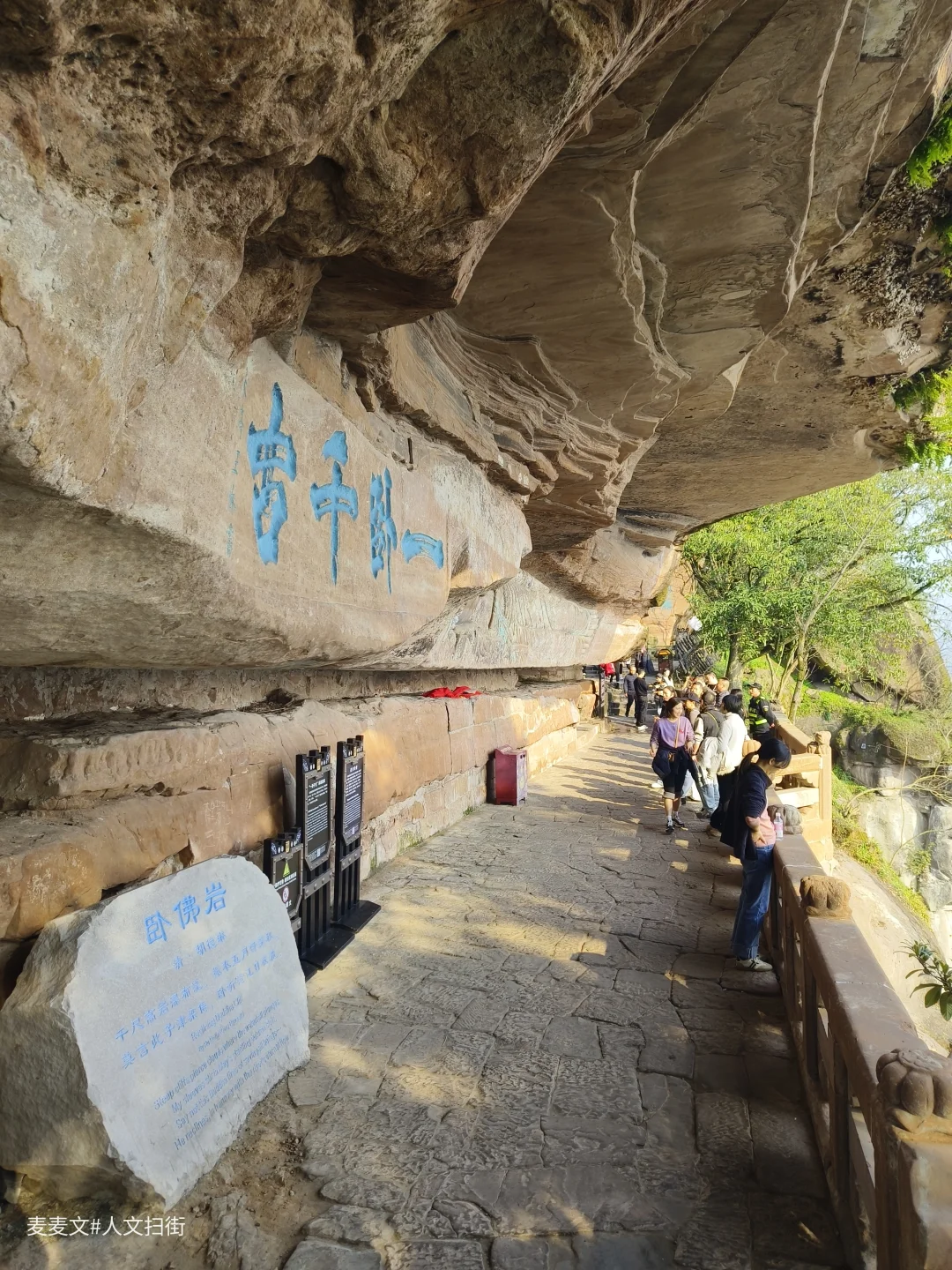 佛首上方,南宋学者王休题写的“一卧千古”四个大字笔力雄健,字径达0.65米,与卧佛意境完美相融,堪称钓鱼城“摩崖三绝”之一。历经宋元战火与千年风雨,佛身彩绘虽有斑驳,却依旧庄严。