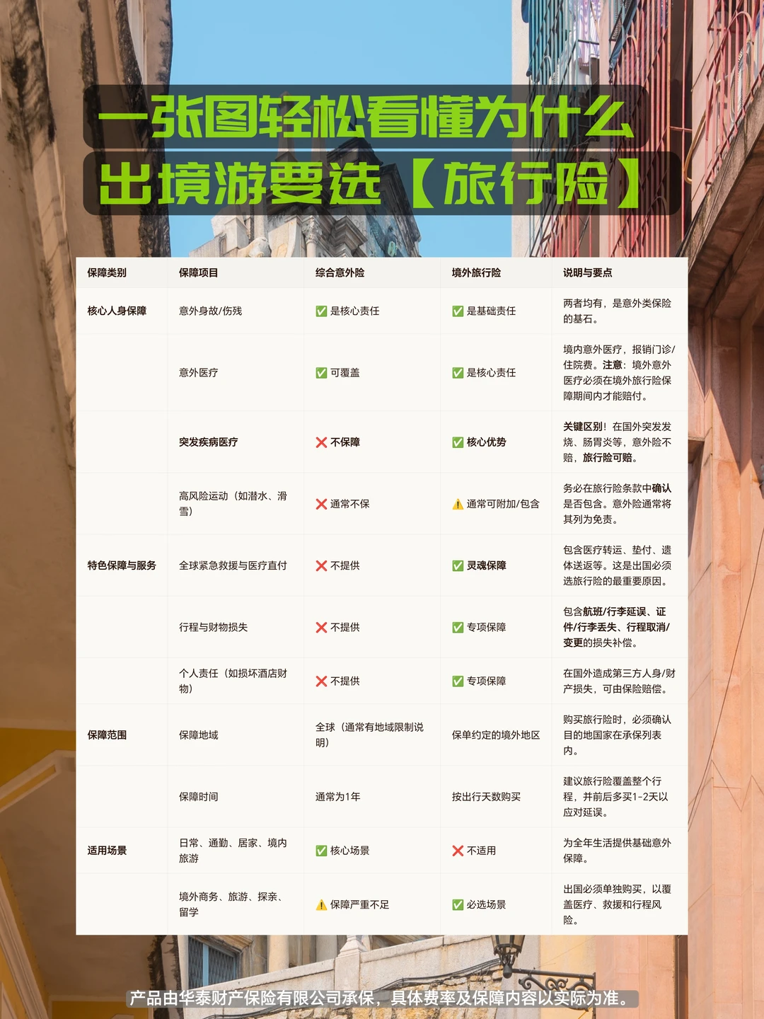 我之前以为一份意外险就够用了,后来仔细对比了一下发现意外险一旦涉及到出境旅行,很多都保不了,所以一份旅行险就是极具性价比的保障🔒