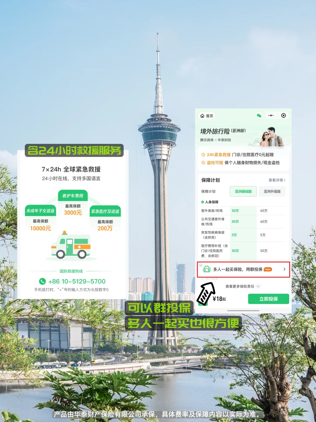 我现在只要去港澳玩,都会在腾讯微保上购买一份境外旅行险(亚洲版),这里不得不提一下它的旅行意外保障有多丰富了!财产/旅行延误/人身保障都涵盖!财产损失最高1万,旅行证件丢失/旅行变更累计最高5000元;其次航班延误累计最高900元,行李延误累计最高2000元。