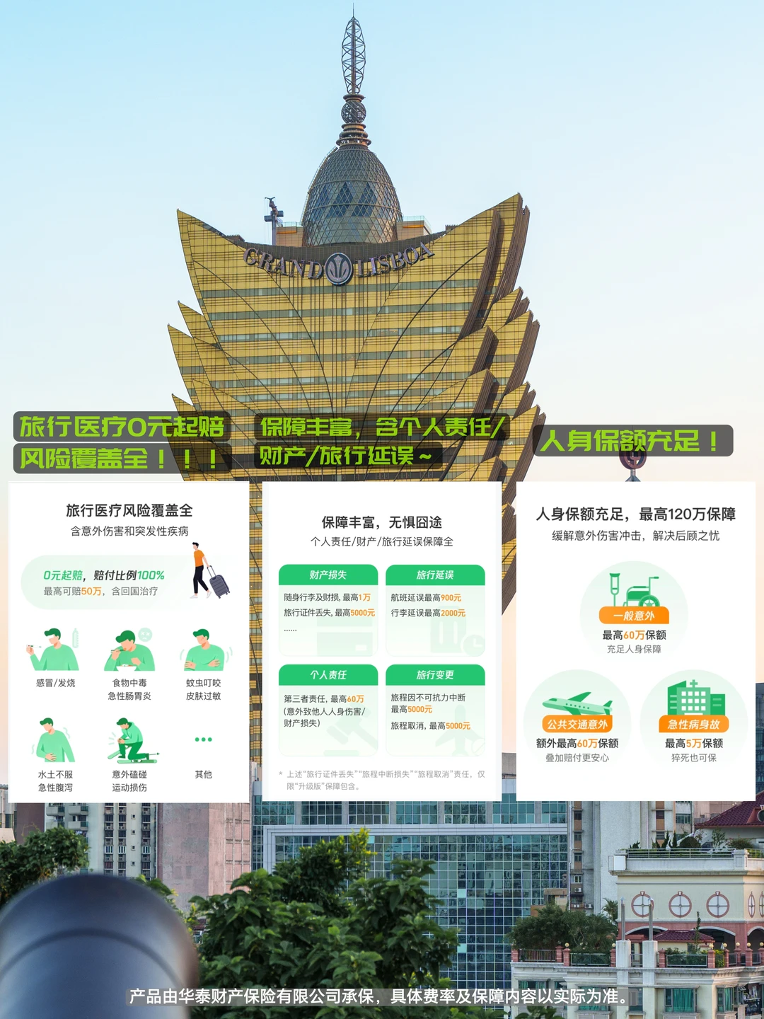 旅行医疗风险覆盖也很全,0元起赔,赔付比例100%,承担旅行途中因意外伤害或突发性疾病所产生的急诊、门诊、住院等合理医疗费用,例如感冒发烧、食物中毒、水土不服、意外磕碰、运动损伤等常见情形~