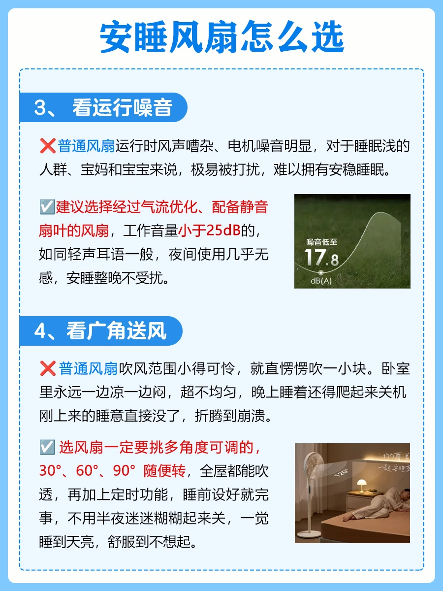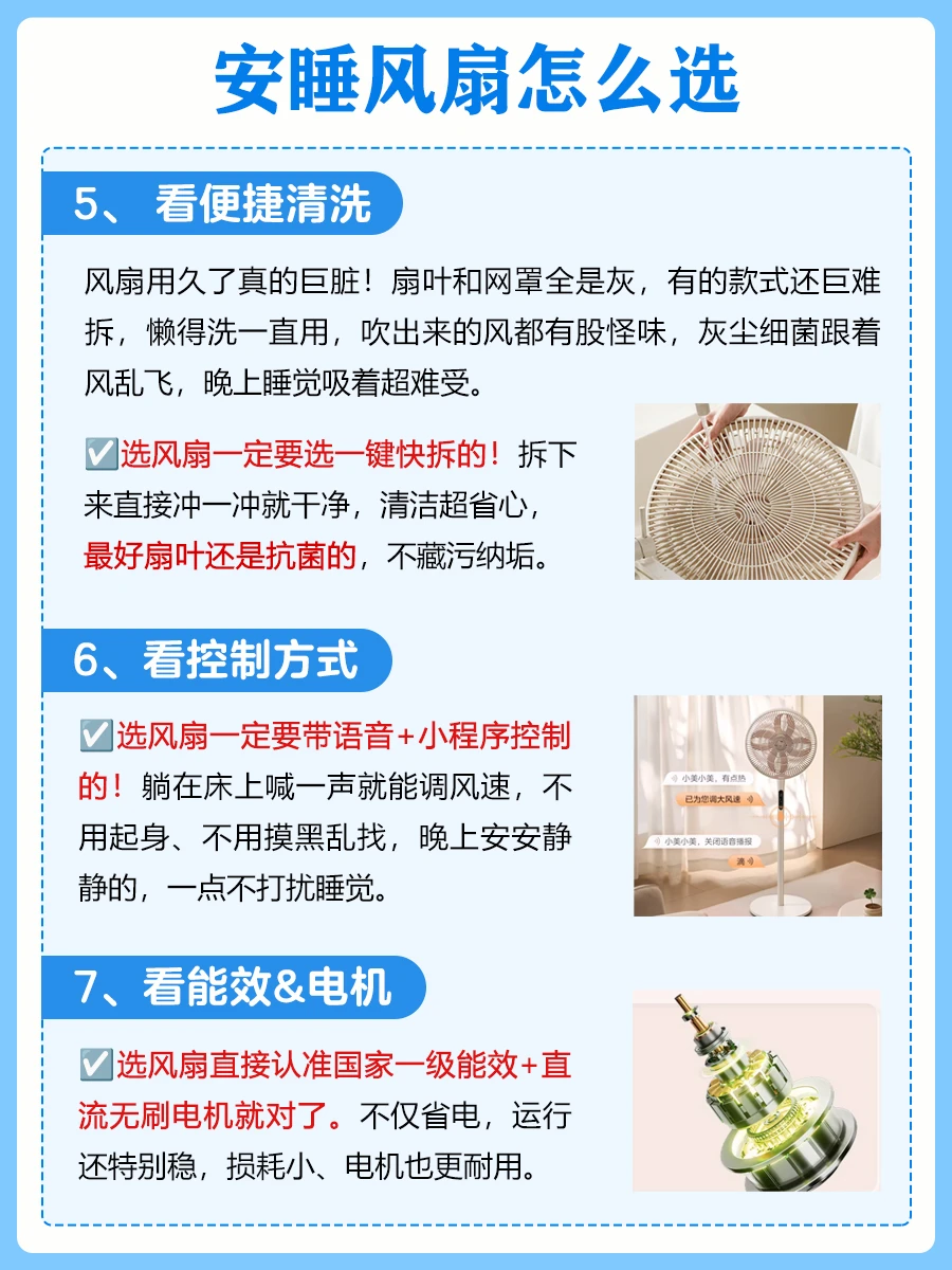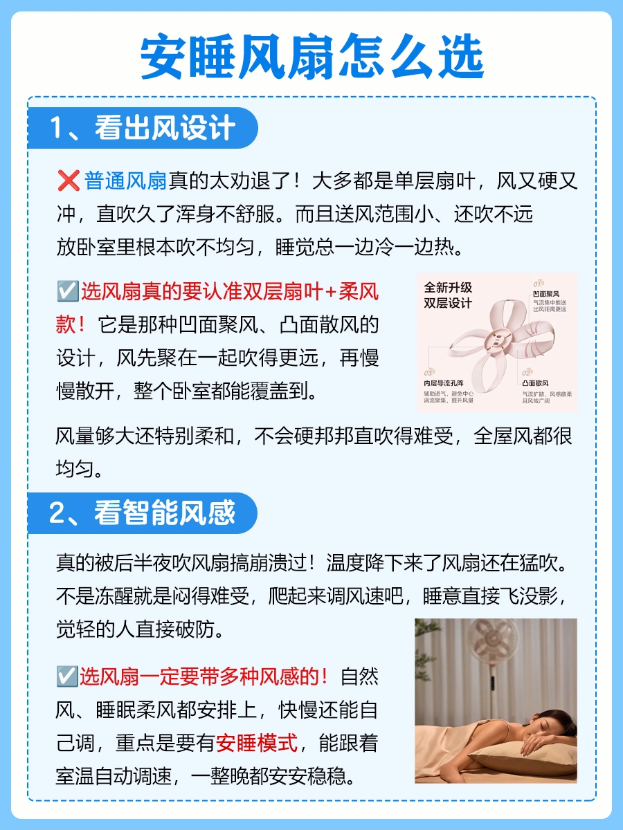 还在随便买风扇?😭普通风扇硬风直吹容易头晕、风感单一越吹越燥,深夜运行噪音大吵到失眠,送风角度死板吹不透全屋,积灰难拆洗滋生细菌,操作繁琐起身调节麻烦,再加上电机老旧费电又短命,越用越闹心。 📝别再踩坑了,选对风扇认准这几点,舒适又省心: 1️⃣看出风设计 选风扇真的要认准双层扇叶+柔风款! 2️⃣看智能风感 选风扇一定要带多种风感的!自然风、睡眠柔风都安排上,重点是要有安睡模式。 3️⃣ 看运行噪音 选经过气流优化、配备静音扇叶的风扇,工作音量小于25dB的。 4️⃣看广角送风 选风扇一定要挑多角度可调的,30°、60°、90°随便转。 5️⃣看便捷清洗 一定要选一键快拆的!最好扇叶还是抗菌的。 6️⃣看控制方式 选风扇一定要带语音+小程序控制的! 7️⃣看能效&电机 认准国家一级能效+直流无刷电机就对了。