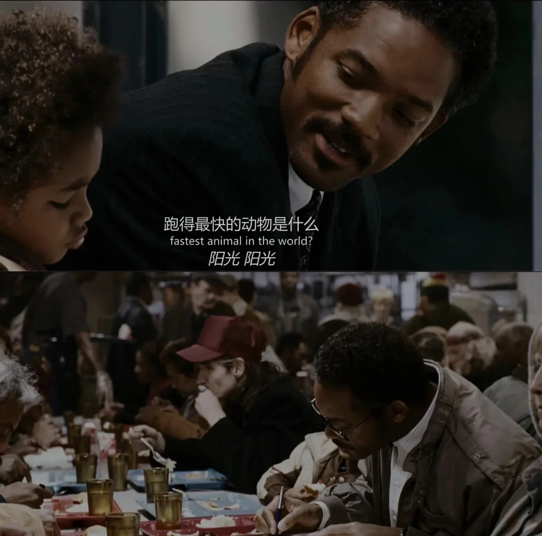 🍀电影里的克里斯,带着孩子挤过地铁厕所,在收容所长时间排队,被生活一次次逼到谷底,狼狈又倔强,却从没有向命运低头。