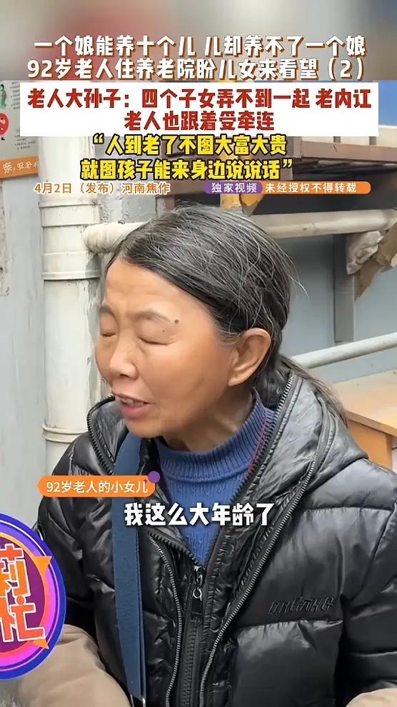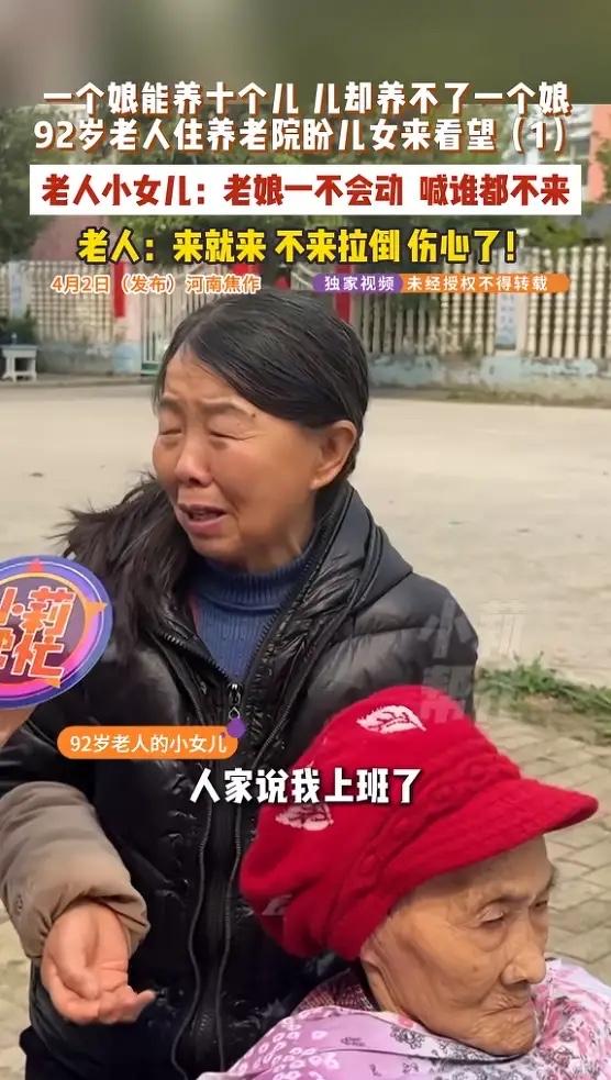 “令人寒心!”河南焦作,一92岁老人养育了4个子女,现在住在养老院,希望儿女来看望她,面对这个合理要求,4个子女却长期内讧,老人对此十分失望,小女儿也哭诉:“一个娘能养十个儿,十个儿养活不了一个娘!”网友:令人唏嘘! 这位老人92岁了,腿脚不便,平时就坐在养老院的窗边,眼睛总往走廊那头看。她在等,等那几声熟悉的脚步声,等儿女推门进来喊一声“妈”。可等来的,常常是空荡荡的走廊和心里越来越深的失望。 老人其实有2000块退休金,法院去年也判四个子女每人每月给500块赡养费,住院费用大家平摊。从账面上看,她吃穿用度都够了。可人老了,图的是这个吗?她自己说过一句话,听着让人心疼:“人到老了不图大富大贵,就图孩子能来身边说说话。” 那四个子女为啥不来?大孙子一句话说到了根上:“都是有孝心的,关键是这4个子女,他们弄不到一起,他们老是闹内讧,所以说老人在中间也受牵连。” 矛盾无非是谁觉得当年分家产不公平,谁觉得照顾老人自己出力多吃了亏,谁又指责对方光动嘴不出力。 他们把对兄弟姐妹的怨气,全变成了对母亲的冷漠。哥哥不搭理,姐姐不接电话。老人从满怀期待,等到心灰意冷,最后对着镜头赌气说:“我谁也不见,不管了,不要他了。来就来,不来拉倒。” 这话听着硬气,里头全是说不出的苦。 难道养老就是每月按时往卡里转500块钱吗?钱给了,义务就尽到了?很多子女都有这个错觉。养老院能管一日三餐,能帮着翻身擦洗,但管不了孤独。那500块钱能买来温饱,买不来那句带着温度的“妈,我来看你了”。这种“转账式尽孝”,成了多少人心安理得的借口。 他们忘了,父母养大十个孩子,喂饱每一张嘴,擦干每一次眼泪,从来不是靠转账完成的。那是日日夜夜的陪伴,是冷了添衣、病了喂药的守护。如今角色调换,父母要的,也不过是这份陪伴的零头。他们不需要山珍海味,不需要绫罗绸缎,只需要你坐在床边,说说你工作上的烦心事,听听孙子孙女又学会了什么新词。 好在经过沟通,老人的大孙子站了出来,他承诺会去说服自己的父亲,争取每周带着孩子去看望奶奶两次。希望其他子女也能早点明白,母亲已经92岁了,她的时间,真的等不起了。有些陪伴,今天不做,明天可能就永远没机会了。 各位读者你们怎么看?欢迎在评论区讨论。