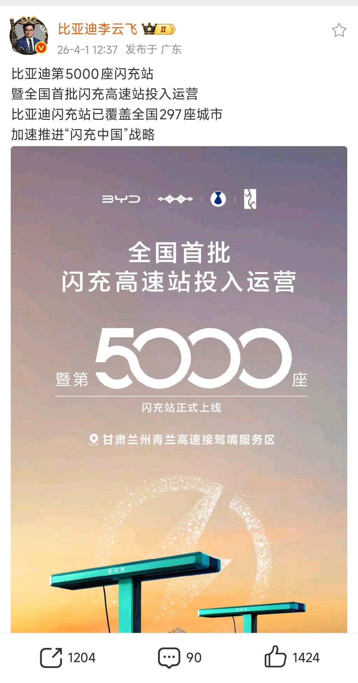 闪充站已经建了5000座?比亚迪这速度也太快了 随着一堆搭载第二代刀片电池和闪充技术的新车型发布,比亚迪的闪充站也在加速。据官方消息,目前第5000座闪充站已经建成,也就是说,距离今年20000座的目标已经完成了1/4。我这几天特地留意了一下,我们这十八线小县城里的比亚迪门店门口也建了一个闪充站,貌似已经对外开放,比亚迪这边的数据是目前已覆盖全国297座城市,这速度对于购买支持闪充技术的新车来说,更有信心了。 有了这些闪充站,不是马上就要到清明假期,接着就是五一小长假。搭载第二代刀片电池和闪充技术的比亚迪新车,通过闪充站,基本能够实现“5分钟充好,9分钟充饱,零下30度只多3分钟”,长途充电体验大幅提升。 关键是比亚迪的闪充站还可以给其他品牌车型使用,而且充电的效率虽然达不到比亚迪的车子,但是同样会很快。我只能说比亚迪这招下的真的是“狠”,但是,真好!【来自懂车帝车友圈】