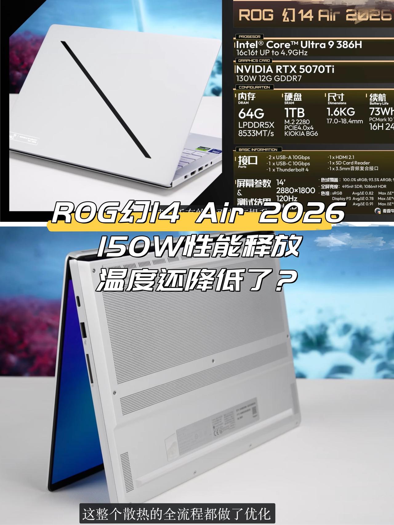 不是吧?性能释放涨到150W还降温!? 之前一直觉得高性能全能本性能强了肯定烫手 但刚刚刷了了UP主@麦香牛奶 的上手视频,发现新款幻14 Air 2026的双烤表现还不错啊 性能释放冲到了150W 比上一代130W还强! 而且性能上去了,温度居然还降了?! 视频里说实测下来,就算性能拉满,键盘WASD区域也就40度左右 上手只是温温的,完全不会烫手 内吹风2.0+VC均温板这套散热架构确实有点东西👍 🤔关键是性能提升+散热更猛的情况下 幻14 Air 2026机身也贼轻薄 续航还直接翻倍,以前5个半小时现在是11小时多 低功耗能效进步巨大💪 还有一块2.8K 120Hz OLED星云原画屏 亮度干到1140nits还加了抗反射涂层 真的有点“六边形战士”那意思了 - 👀说实话上代我纠结的点就是散热 现在幻14 Air 2026这个短板彻底补上了 1.57kg的小钢炮,能剪片能打游戏还能带出去办公一整天,基本没啥槽点了...想冲😊 笔记本电脑轻薄本数码爱好者 ROG幻14 Air 2026