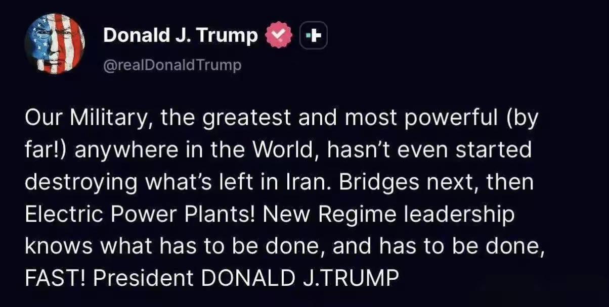 懂王又发帖放狠话:我们的军事力量是世界上最强大、最无敌的(遥遥领先!),还没开始摧毁伊朗剩下的东西。接下来是(炸)桥梁,然后是(炸)发电厂!(伊朗)新政权领导层知道必须做什么,而且必须迅速行动! 不靠谱嘴上说想结束战争,行动却不断升级、威胁轰炸桥梁与电厂,本质是既想体面收兵,又不甘心未彻底打服伊朗,于是用摧毁民生设施的极限施压逼伊朗妥协。这种边打边吓、以战逼降、不断升级的做法,只会让这场战争更难收场,这老头就跟精神分裂一样,一会儿要谈判一会儿又十分强硬。但是现在说这种狠话,就在特朗普发帖前不久,美以刚刚袭击了德黑兰附近卡拉杰的B1桥。伊朗外长阿拉格齐立即回应:打击包括未完工桥梁在内的民用设施,不会迫使伊朗人投降。伊朗已经不怕了,手里有牌可打,可对等报复,以色列也有发电厂,还有海水淡化厂,而且由于以色列是弹丸之地,这些基础设施都很集中,更好打。特朗普的行事风格对美国政坛有何影响