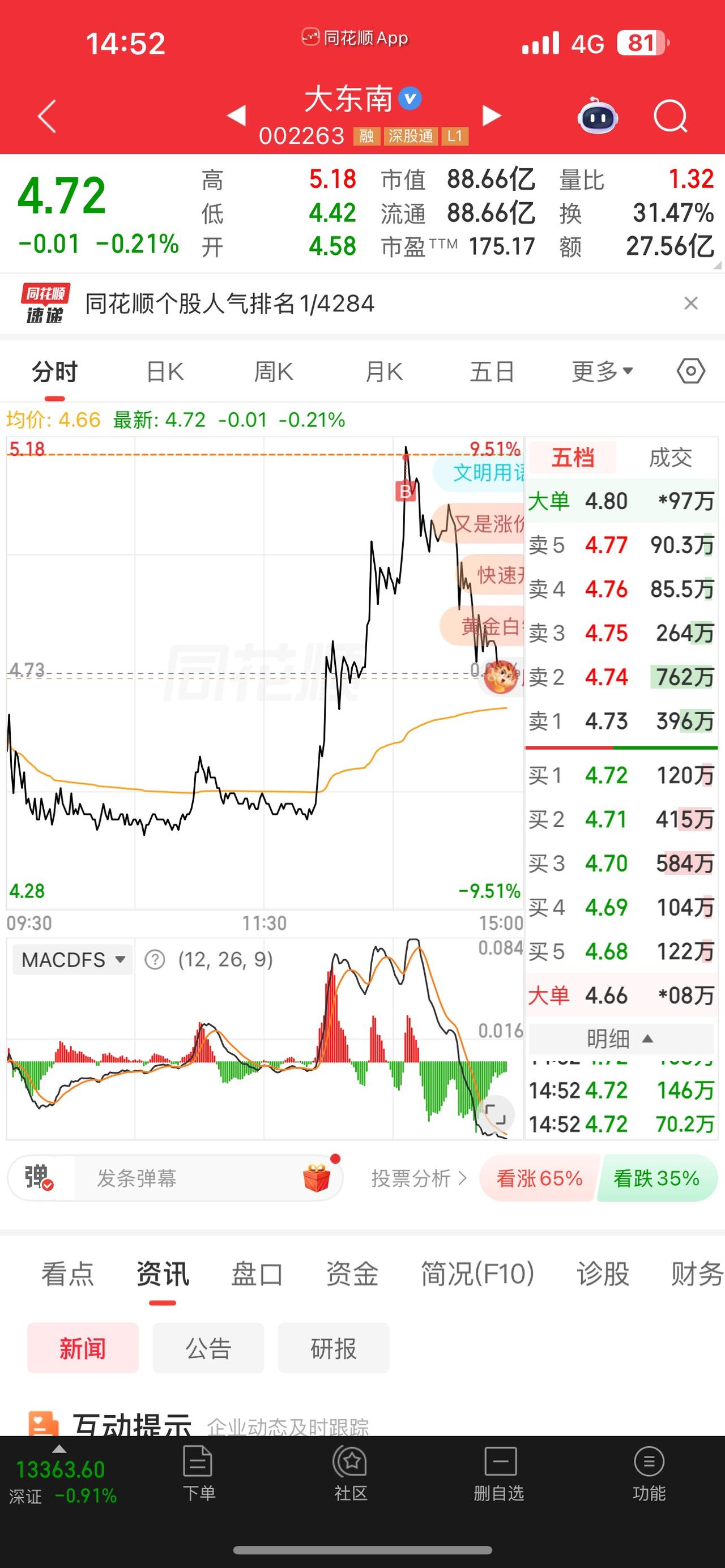 一位湖南的股民追在最高点了,买完他就后悔了,他发文说”主力就为了我这三瓜俩枣吗?”。 他今天一只盯着该票,耐心等待入场时机。第一波拉升股价翻红,他一点都不慌,心想就这点涨幅骗不了他。第二波拉升涨了四五个点,他开始有点激动了,赚钱的机会来了,此时他还没有动手。第三波拉升他眼疾手快,立刻按下买入按键5.18元成交了。 后面的情况让他唉声叹气,股价一直回落到收盘,当天浮亏十个多点。下周开盘又要割肉了。他想不明白,主力拉到9个点意欲何为,难道就是为了诱多吗? 个人感觉只看图形是没用的,图形就是资金做出来给散户看的,必须要理解精髓呀。还有只盯着一只票看,也是没啥用的。 希望这位湖南的股友,一定要沉下心来,早日突破自己吧。