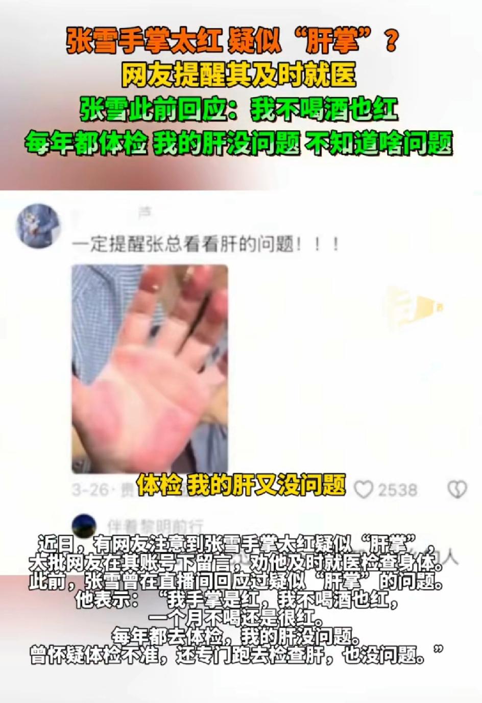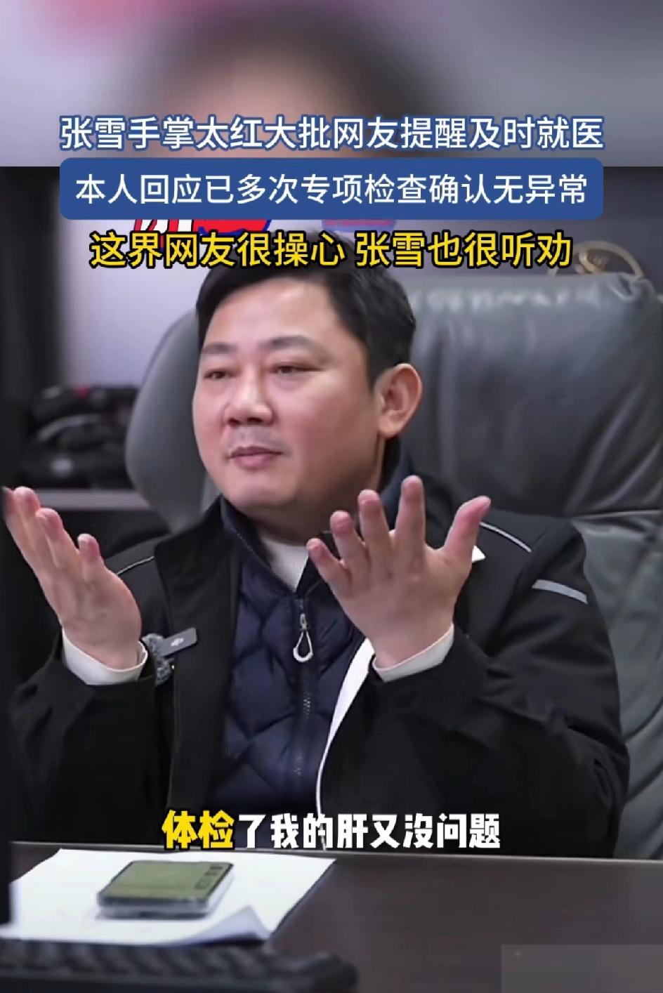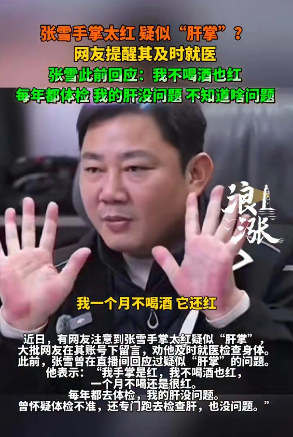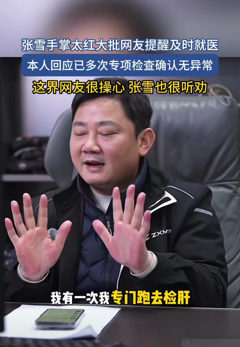 张雪手掌太红,疑似“肝掌”?有网友提醒张雪,说他手掌红是不是肝有问题?张雪很听劝,去医院检查。他说我每年都做体检,还专门体检,肝一点问题也没有,不知道是怎么回事。 还有网友从中医理论上来讲说,肝部不出现大问题是检查不出来的,你可能是肝火旺盛,胃热脾虚手脚发热导致的红。 有没有一种可能他天天开机车,手握摩托车把手导致的红。
