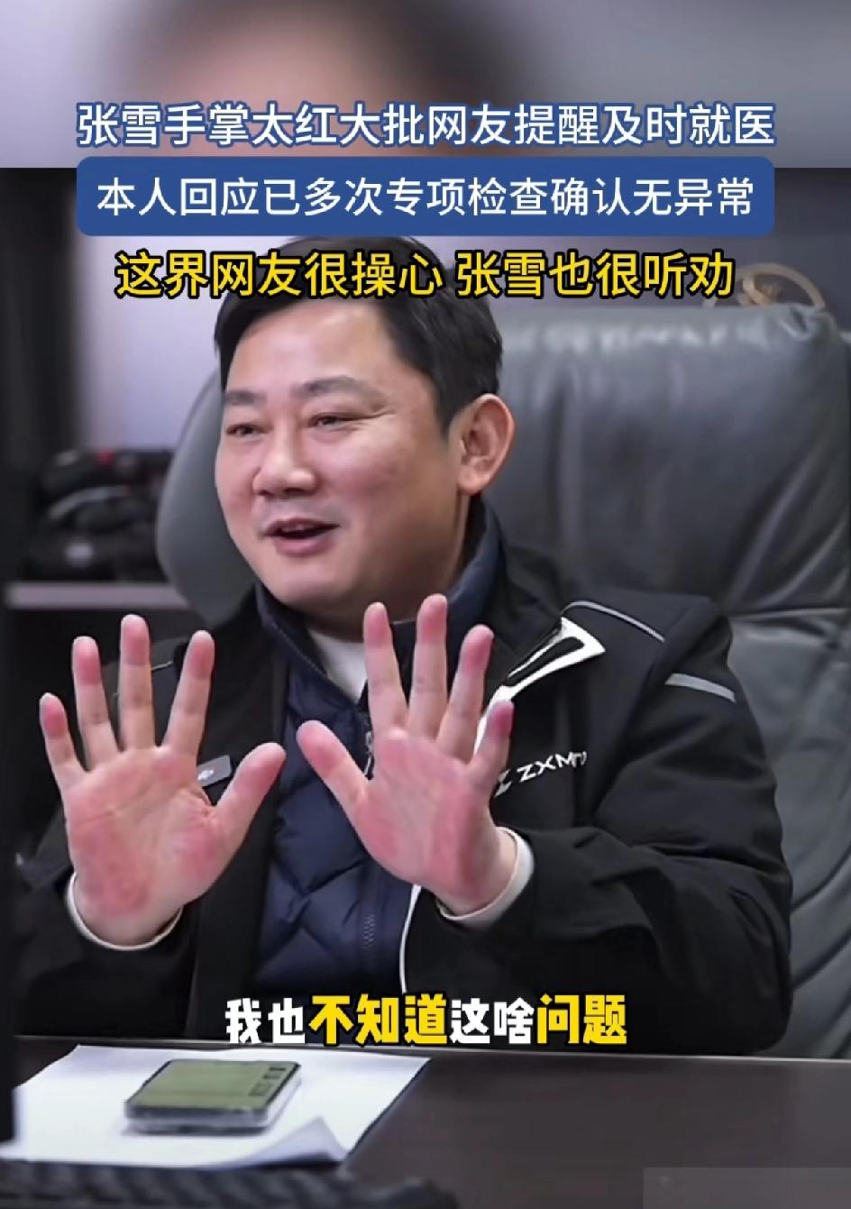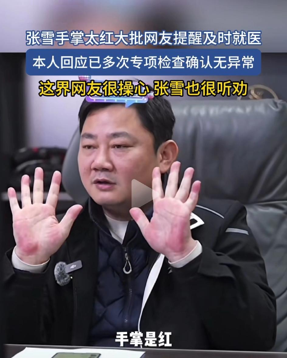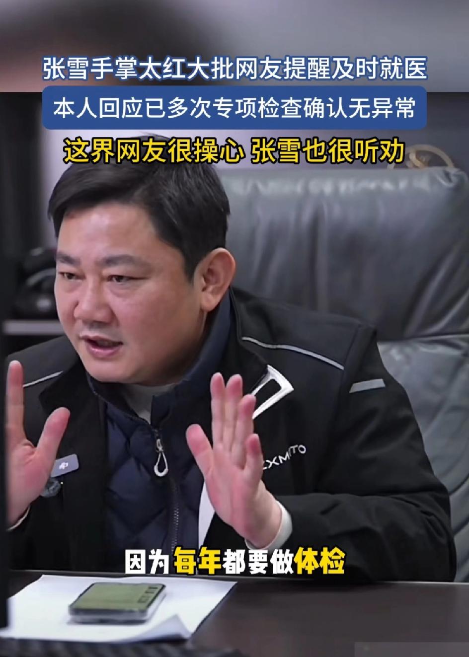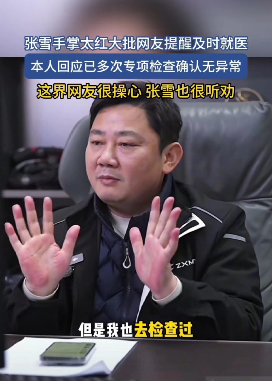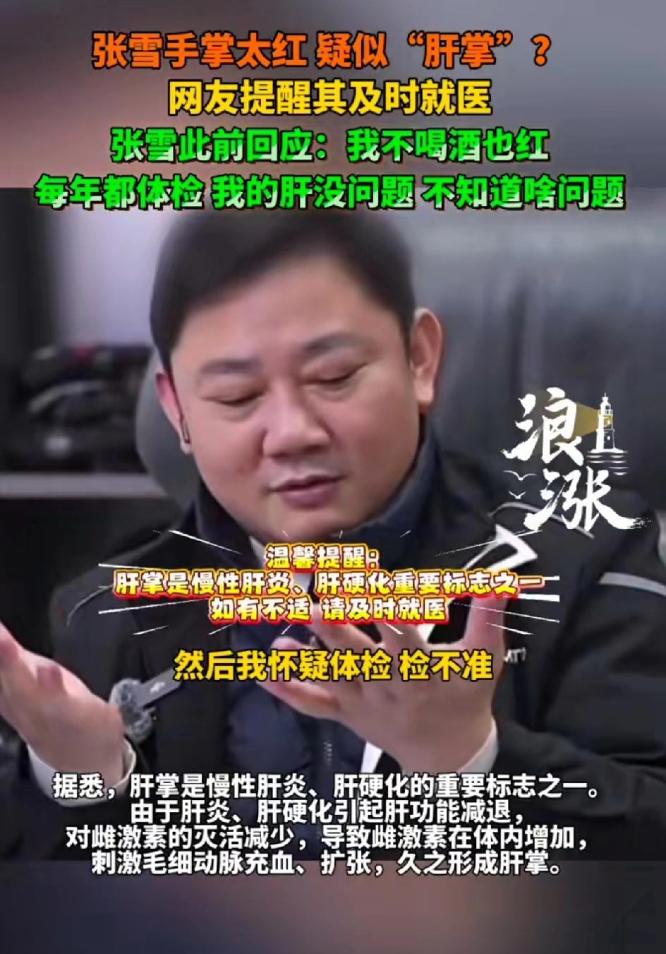 张雪手掌太红,疑似“肝掌”?有网友提醒张雪,说他手掌红是不是肝有问题?张雪很听劝,去医院检查。他说我每年都做体检,还专门体检,肝一点问题也没有,不知道是怎么回事。 还有网友从中医理论上来讲说,肝部不出现大问题是检查不出来的,你可能是肝火旺盛,胃热脾虚手脚发热导致的红。 有没有一种可能他天天开机车,手握摩托车把手导致的红。