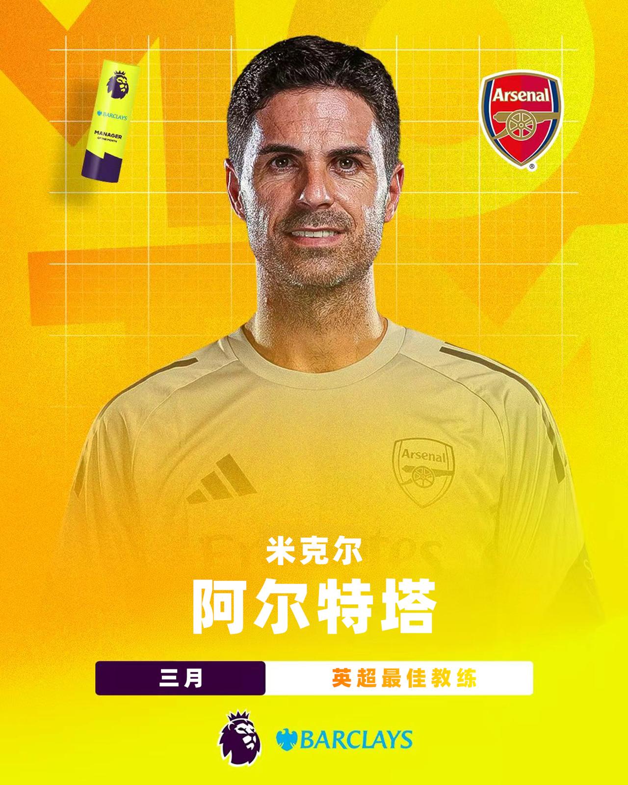 Barclays 英超3月最佳教练:阿尔特塔 阿尔特塔带领阿森纳在3月的3场英超中取得全胜