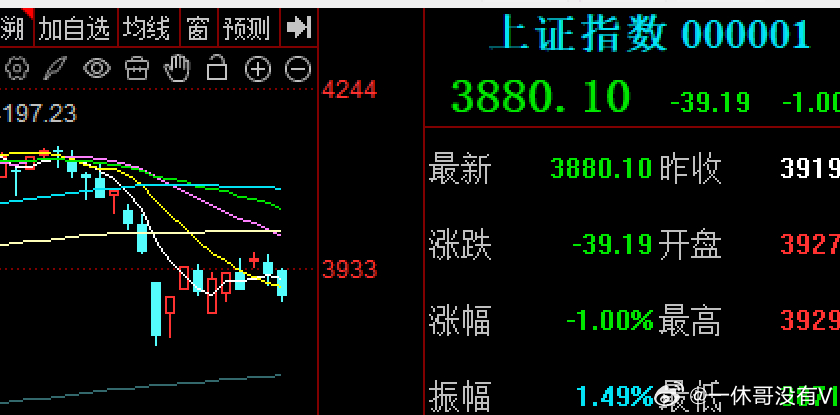 清明时节雨纷纷,路上股民欲断魂今天的大A走势真是无力吐槽,行情太拉胯了,昨晚美股大幅低开一度杀到2%猴就被直线拉起来,纳指还翻红了,当什么都没发生,而亚太的日韩同样强势反弹,分别涨1.26%和2.74%,看似没什么发生,但差别咋就这么大呢大A直接高开8个点到3927点,随即冲高到3929点,涨了两个点就遇阻回落了,第一波下探到3900点后出现了一度拉升,但失败,下午一点半又来了还是失败,最后就破罐子破摔了,失守3900点,跌了39个点,3880收盘一根中阴线本周三阴两阳K线修复组合,但到了3950附近就被打下来了,周跌0.86%,冲高回落
