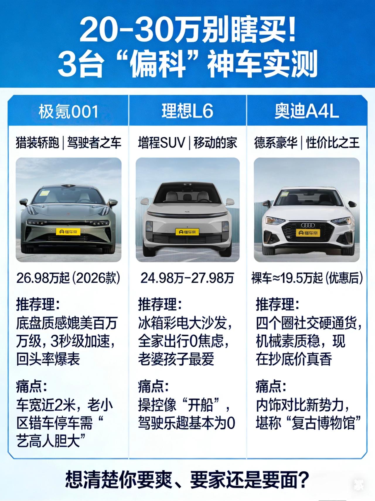 20-30万买车最容易“踩坑”?这3台车谁买谁真香! 兄弟们,今天聊的这个价位段,20-30万,我愿称之为“成年人的选择题”。 为啥这么说?因为到了这个预算,你既想要面子,又想要里子;既想体验新能源的科技感,又放不下传统豪华品牌的“标”。 说白了,就是“既要又要还要”。 但现实很骨感,这个价位段没有完美的车,只有最适合你的“偏科生”。今天我帮你挑出3台,分别对应三种不同的人设,你直接对号入座,省得自己纠结到头秃。 1. 驾驶爱好者:“油门一踩,烦恼拜拜” 👉 闭眼入:极氪001 如果你是个对驾驶有追求的人,开过油车也试过电车,那我劝你直接看2026款极氪001。 这玩意儿,我愿称之为“国产操控天花板”。你别说它车重大、车身宽,开起来那叫一个稳。底盘质感跟德系豪车有得一拼,过个减速带、烂路,那叫一个“Q弹”,不颠不晃。 而且它的猎装造型,开出去回头率真的高。你想想,优惠后25万级的车,长得像五六十万的保时捷Panamera,这排面不就来了吗? 当然,槽点也有。车机系统比老款聪明太多了,用的是高通8295芯片,但操作逻辑偶尔还是有点“轴”。另外车身确实宽,老小区停车得小心点。 一句话总结: 如果你不在乎车机是不是“百科全书”级别的聪明,只在乎方向盘握在手里的感觉,冲它就对了。 2. 超级奶爸:“家里领导满意,才是真的满意” 👉 闭眼入:理想L6 我知道有人要喷:“增程技术落后!” 但兄弟,技术先不先进不重要,老婆孩子舒不舒服才重要。 理想的逻辑很简单:我不跟你比参数,我跟你比谁更懂“家”。坐进L6里,你就明白了什么叫“移动的精装三房”。座椅软得像大沙发,后排空间大到孩子能打滚。前面还给你配了个大彩电,长途旅行孩子不哭不闹,这比什么百公里加速3秒都实在。 而且它没有里程焦虑,可油可电。平时市区通勤用纯电,一公里几分钱;节假日出远门用油,说走就走。 槽点是啥? 开它确实没啥驾驶乐趣,像开一艘船,晃晃悠悠的。另外有些人觉得理想的车长得像“套娃”,L6、L7、L8、L9放一块,傻傻分不清。 一句话总结: 结婚有娃了,别纠结什么操控、什么技术路线了,谁让你家领导和孩子上车就笑,你就买谁。 3. 面子需求型:“这个标,就是我的社交硬通货” 👉 闭眼入:奥迪A4L 有些人要说了:“都2026年了还买BBA入门级?” 但咱们得承认一个现实:在某些场合,四个圈就是比国产新势力好使。 现在是抄底奥迪A4L的最佳时机。终端优惠巨大,裸车价已经跌破20万,落地也就22万左右。用以前买雅阁、凯美瑞的钱,现在能开走一台正儿八经的德系豪华B级车。它的机械素质没得挑,双离合调教得跟AT一样顺,底盘扎实跑高速稳如老狗。 而且这车属于“没毛病”选手。你说它有多惊艳?没有。你说它有啥硬伤?也没有。中庸、均衡、不出错,这就是它的生存之道。 槽点呢? 内饰对比国产车的冰箱彩电大沙发,确实有点“复古”了。智能化配置也基本等于“老年机”水平。 一句话总结: 如果你需要一台车帮你撑场面、谈生意,或者追求极致的品牌性价比,A4L是现在最香的“入场券”。 【最后的真心话】 兄弟们,20-30万这个价位段,最忌讳的就是“既要又要”。 - 想要驾驶快感,就别嫌极氪001的车机逻辑轴; - 想要全家舒服,就别嫌理想L6开起来像船; - 想要社交排面,就别嫌奥迪A4L内饰复古。 想清楚你最不能妥协的那一点,其他的缺点能忍,就是你的“梦中情车”。 这期就到这,觉得实在的评论区扣个“1”,下期你想看啥价位段?留言告诉我,我接着唠!【来自懂车帝车友圈】
