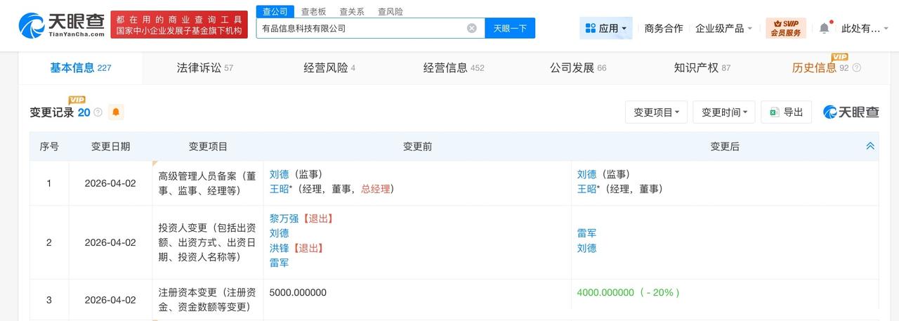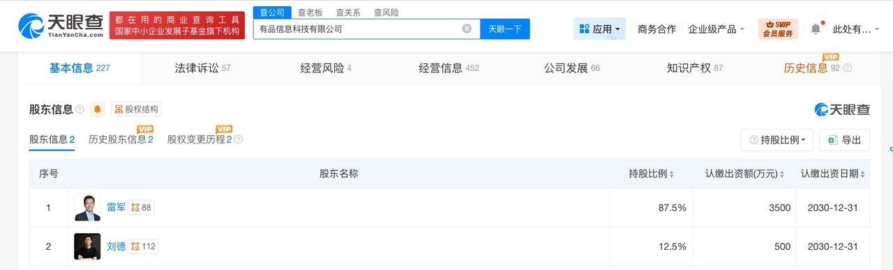 雷军名下有品信息科技公司减资至4000万 雷军名下有品信息科技公司减资1000万 天眼查工商信息显示,近日,有品信息科技有限公司发生工商变更,黎万强、洪锋退出股东行列,注册资本由5000万人民币减至4000万人民币,同时,部分高管发生变更。 有品信息科技有限公司成立于2018年4月,法定代表人为王昭,经营范围含互联网信息服务、互联网销售、企业管理咨询、信息技术咨询服务、仪器仪表修理、会议及展览服务、组织文化艺术交流活动等。股东信息显示,该公司现由雷军、刘德分别持股87.5%、12.5%。 天眼查信息:
