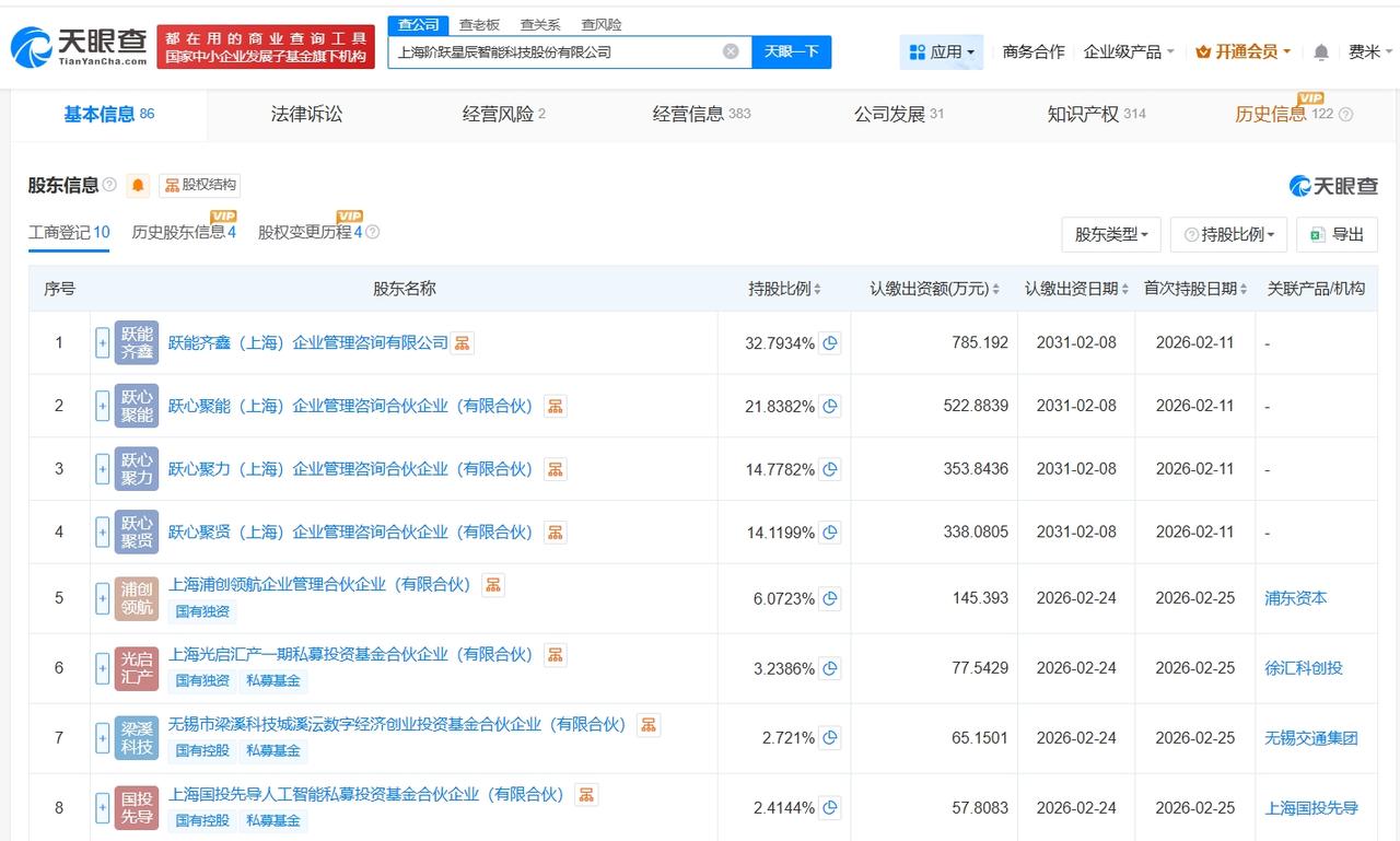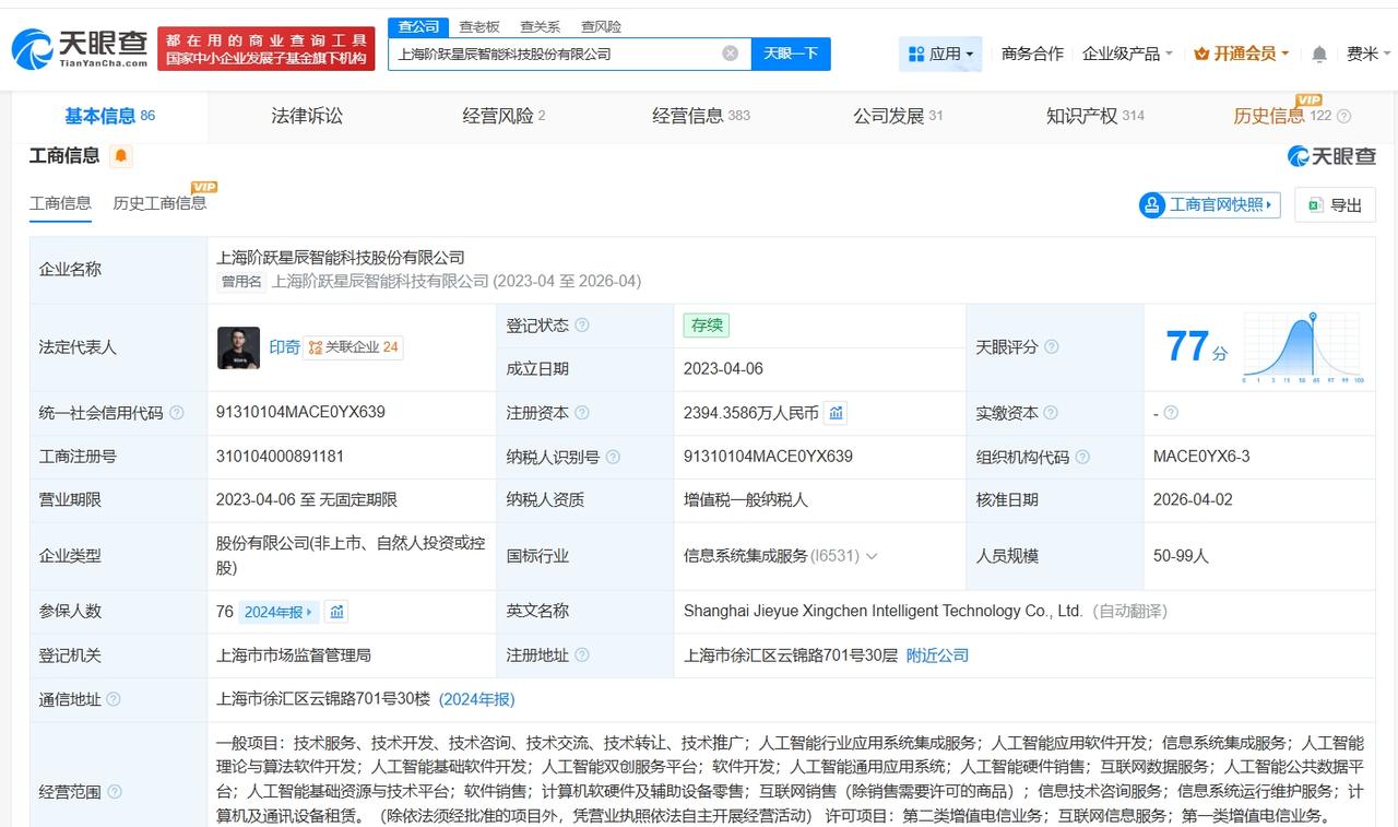 阶跃星辰变更为股份公司 阶跃星辰完成更名 天眼查App显示,近日,上海阶跃星辰智能科技有限公司发生工商变更,企业名称变更为上海阶跃星辰智能科技股份有限公司。 该公司成立于2023年4月,法定代表人为印奇,注册资本约2394万人民币,经营范围包括人工智能行业应用系统集成服务、人工智能应用软件开发、人工智能理论与算法软件开发等,由跃能齐鑫(上海)企业管理咨询有限公司、跃心聚能(上海)企业管理咨询合伙企业(有限合伙)、跃心聚力(上海)企业管理咨询合伙企业(有限合伙)等共同持股。 天眼查信息: