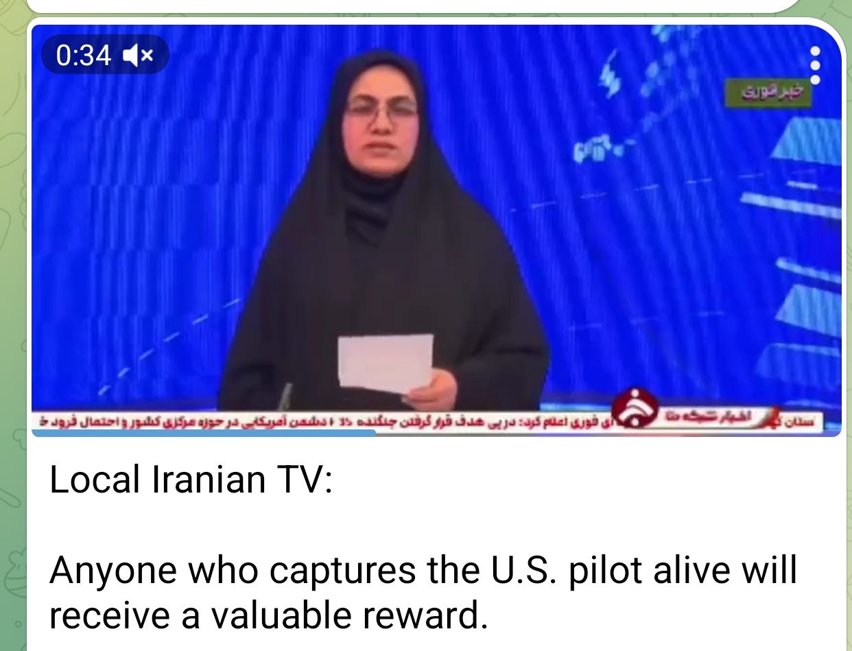 伊朗当地电视台报道:任何能活捉美国飞行员的人,都将获得丰厚的奖金。伊朗称再次击落