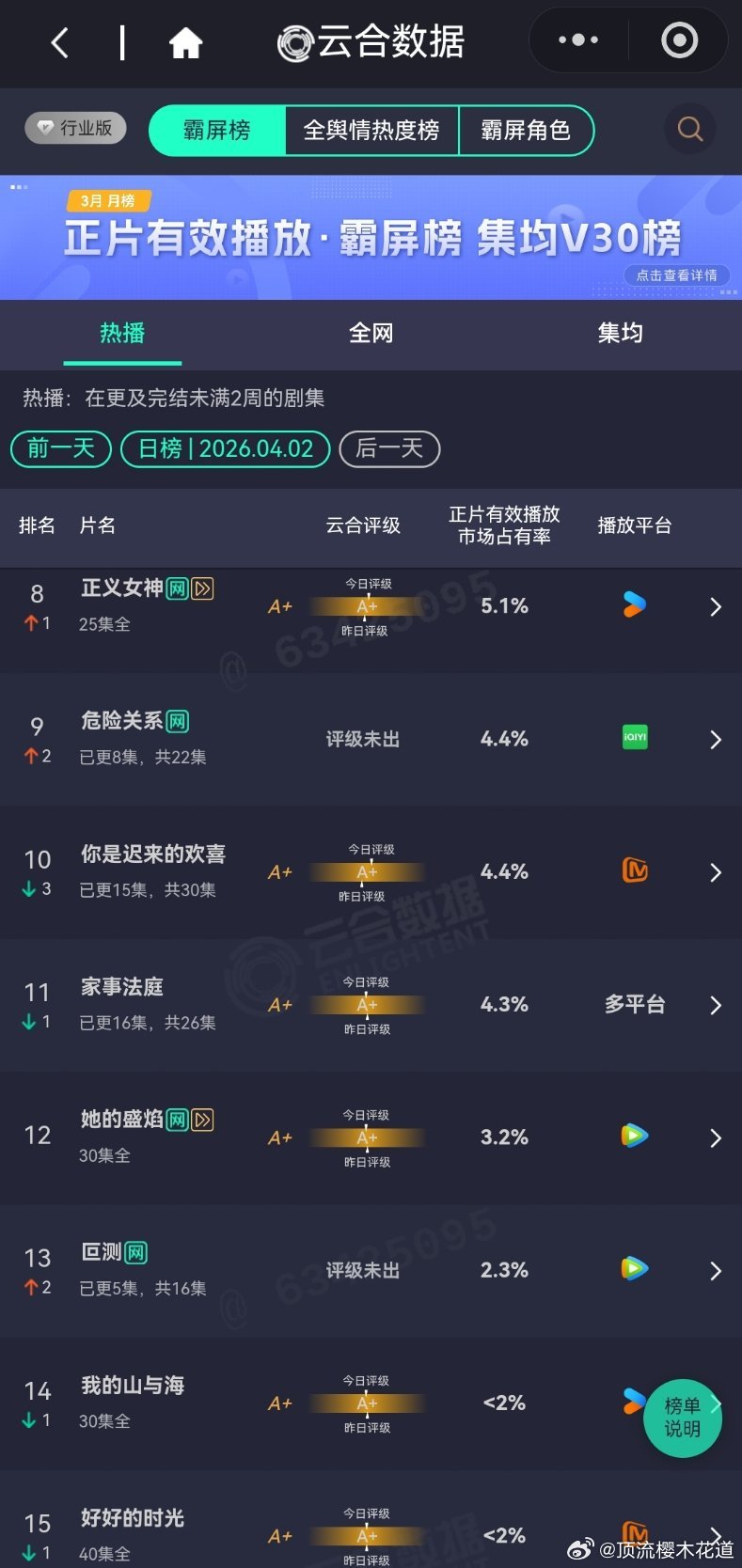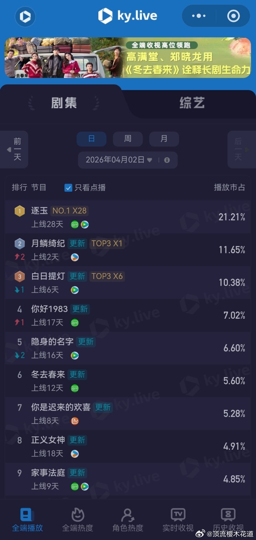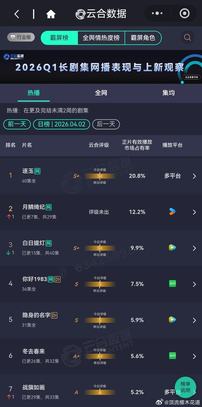4月2日云合播放占比云合 VS酷云逐玉云合20.8%,酷云21.21%月鳞绮纪云合12.2%,酷云11.65%预计周末就能登顶了。白日提灯云合9.9%,酷云10.38%,白日被月鳞超越不冤,毕竟后者男帅女美演技好,后面搞不好还会碾压呢。