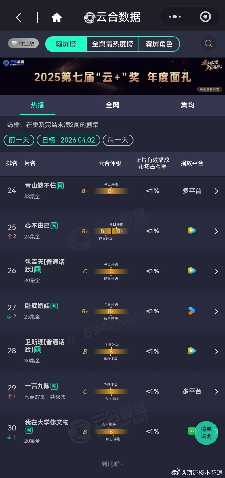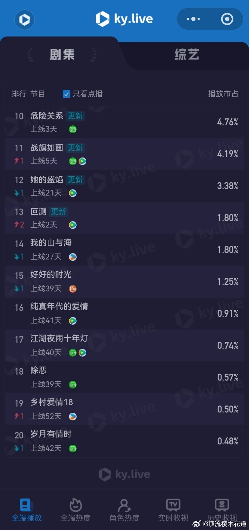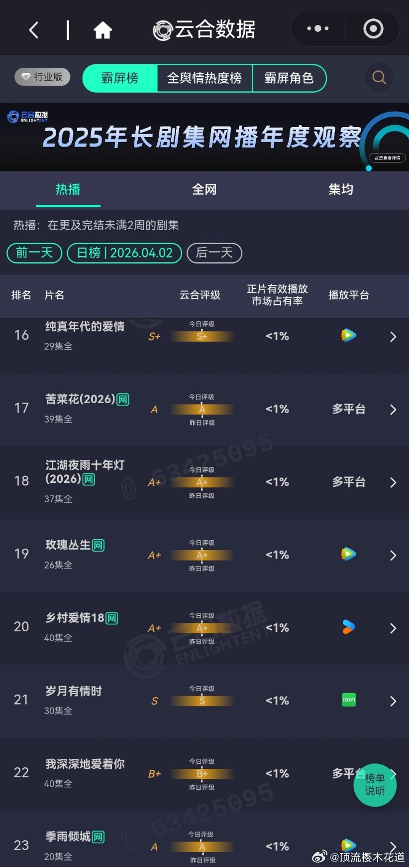 4月2日云合播放占比云合 VS酷云逐玉云合20.8%,酷云21.21%月鳞绮纪云合12.2%,酷云11.65%预计周末就能登顶了。白日提灯云合9.9%,酷云10.38%,白日被月鳞超越不冤,毕竟后者男帅女美演技好,后面搞不好还会碾压呢。
