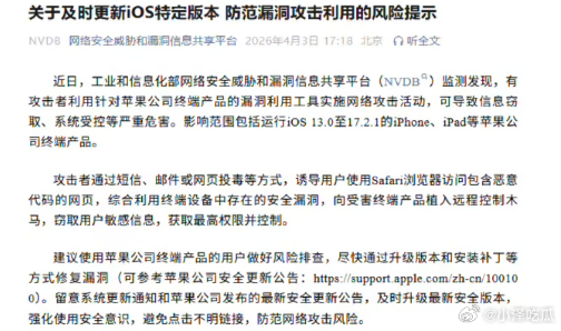 工信部紧急提醒苹果用户 主要是针对 iOS 系统存在的已被实际利用的高危安全漏洞,涉及范围广、风险等级高,一旦被攻击可能导致隐私泄露、设备被控制等问题。这次预警及时且必要,既体现了监管部门对用户信息安全的重视,也提醒大家不要忽视系统更新,遇到陌生链接务必提高警惕,尽快升级到最新安全系统才能有效防范风险。 简单来说,就是不要轻易点击陌生链接!