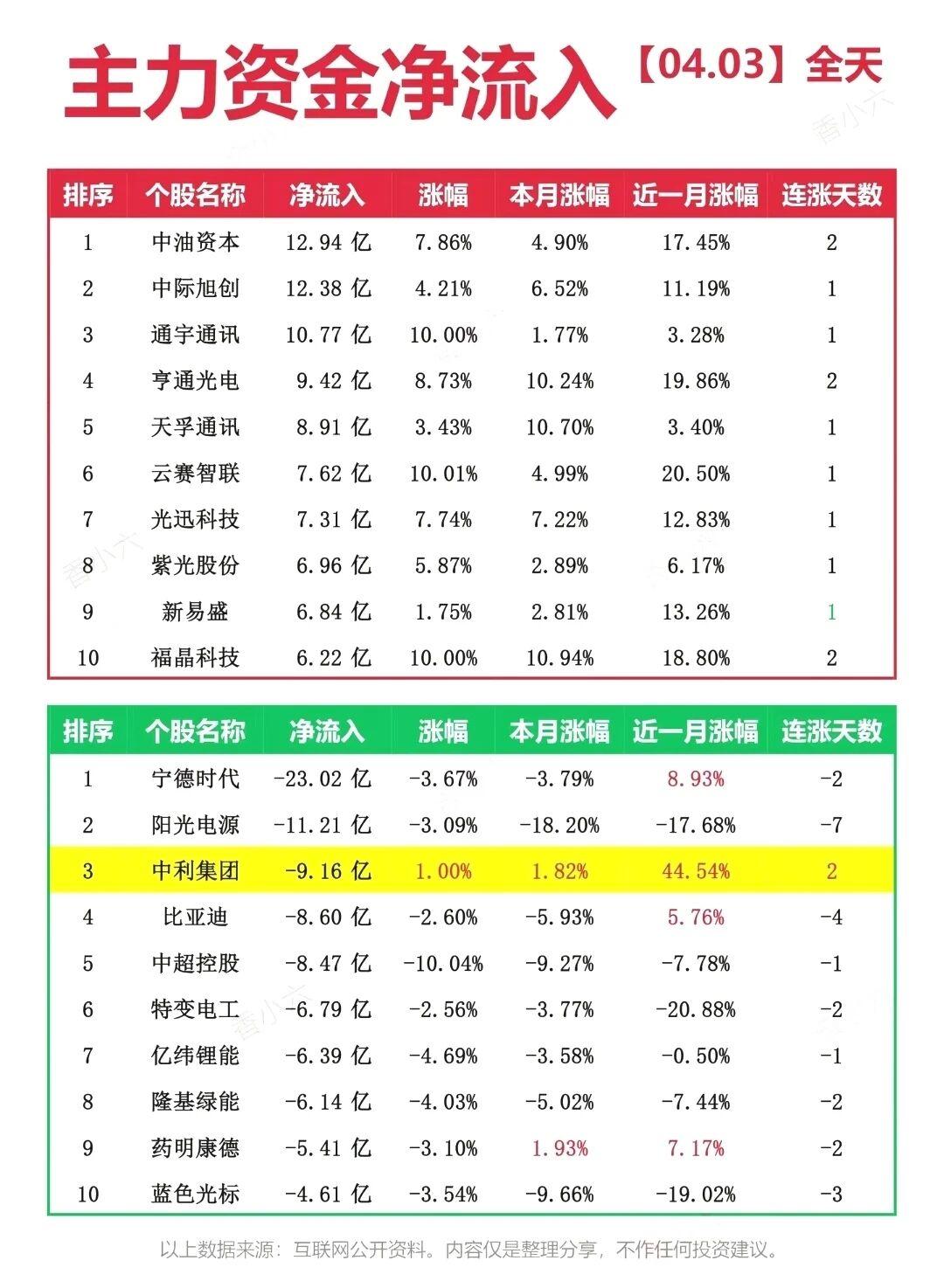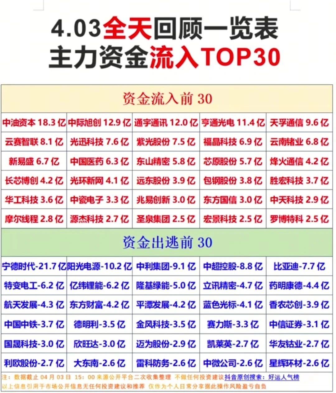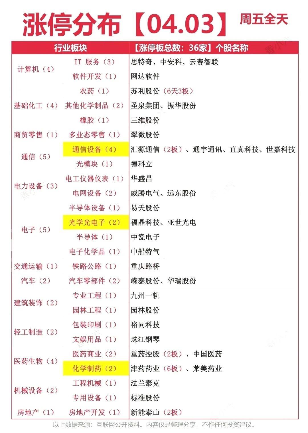 周五A股全线走弱,三大指数集体收跌,资金层面,通信设备板块逆势获81.79亿主力净流入,成为全市场唯一逆势走强的主线;电池、光伏设备、电力等新能源赛道遭资金大幅抛售,净流出额均超30亿。 涨停梯队中,津药药业6板一字封死,成为市场最高标;汇源通讯、新能泰山、重药控股晋级2板,苏利股份6天3板走多日多板路线。从涨停分布看,通信、医药、电子成为涨停股聚集地,通信设备板块4股涨停,延续主线强度,化学制药、光学光电子也有批量涨停。 整体来看,市场进入调整周期,主线资金聚焦通信产业链,新能源赛道持续承压,操作上建议控制仓位,聚焦主线龙头,规避高位回调风险。 风险提示:以上数据来源于公开信息整理,不构成任何投资建议,股市有风险,投资需谨慎。