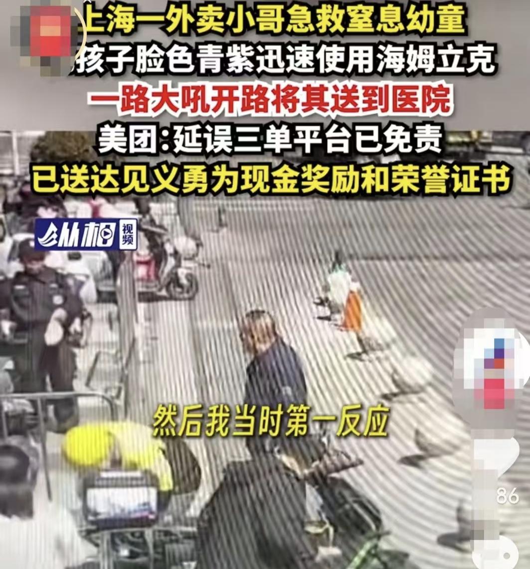 一外卖小哥又火了!事情就是这么巧,事发上海松江,一岁多的娃娃吃饼干被卡住,生命垂危,恰逢河南汉子侯海富路经此地,他的“本能”反应,不仅救了孩子,还感动了全网的人! 3月10号中午,松江一个一岁多的孩子吃饼干卡住了。脸发紫,眼睛翻白,家人抱着哭喊救命,可周围的人除了打120,也是手足无措。 这时候一个外卖小哥冲过来了。他就是侯海富,85年的,河南人,两个孩子的父亲。 他当时手上压着三单,正赶时间。但看见孩子的那一刻,他啥都没想,后来的一句话,“都是当父亲的人,本能就上去帮忙了”让人了解了他的心境。 40秒的海姆立克急救,手都拍酸了,饼干块终于吐出来了。可孩子还是闭着眼。他知道最近的医院,征求孩子妈妈的同意,一把抱起孩子,电动车骑得飞快。 800多米的路,他一手抱娃一手骑车,到医院确认孩子没事,转身就无声的去送上了自己的外卖。那三单肯定超时,他心里很明白外卖订单在孩子的生命面前又算得了什么? 后来孩子父亲加他微信,给他发微信报平安,还给他发感谢红包,说孩子已经出院了。他只是说“这是很小的事儿。”并拒收红包。 有人问他当时怎么不留个证据,他说了句让人鼻子一酸的话:“拿那个还有时间吗?”可见,在他心中自有格局。 美团平台知道这事后,超时订单全免,还给他颁了“先锋骑手”和奖金。 这几年,美团外卖小哥的好人好事不断的涌现,平台的表现也非常给力,正是平台暖心,更进一步激发外卖小哥的爱心。 我相信,爱是可以传递的,希望更多的人学习一下美团外卖小哥,希望更多的平台学习一下美团,这样社会就会更美好。美团 美团外卖 外卖小哥