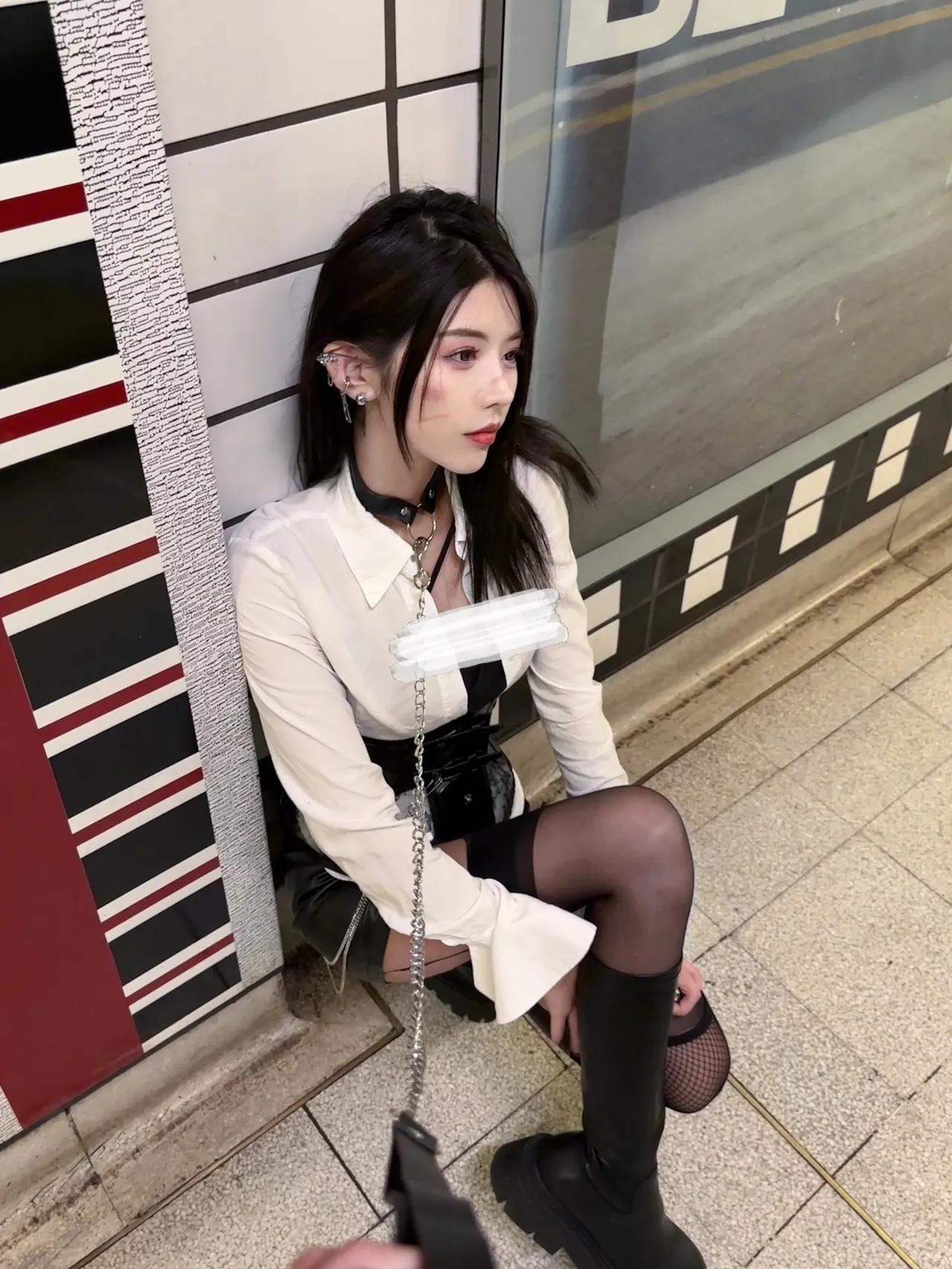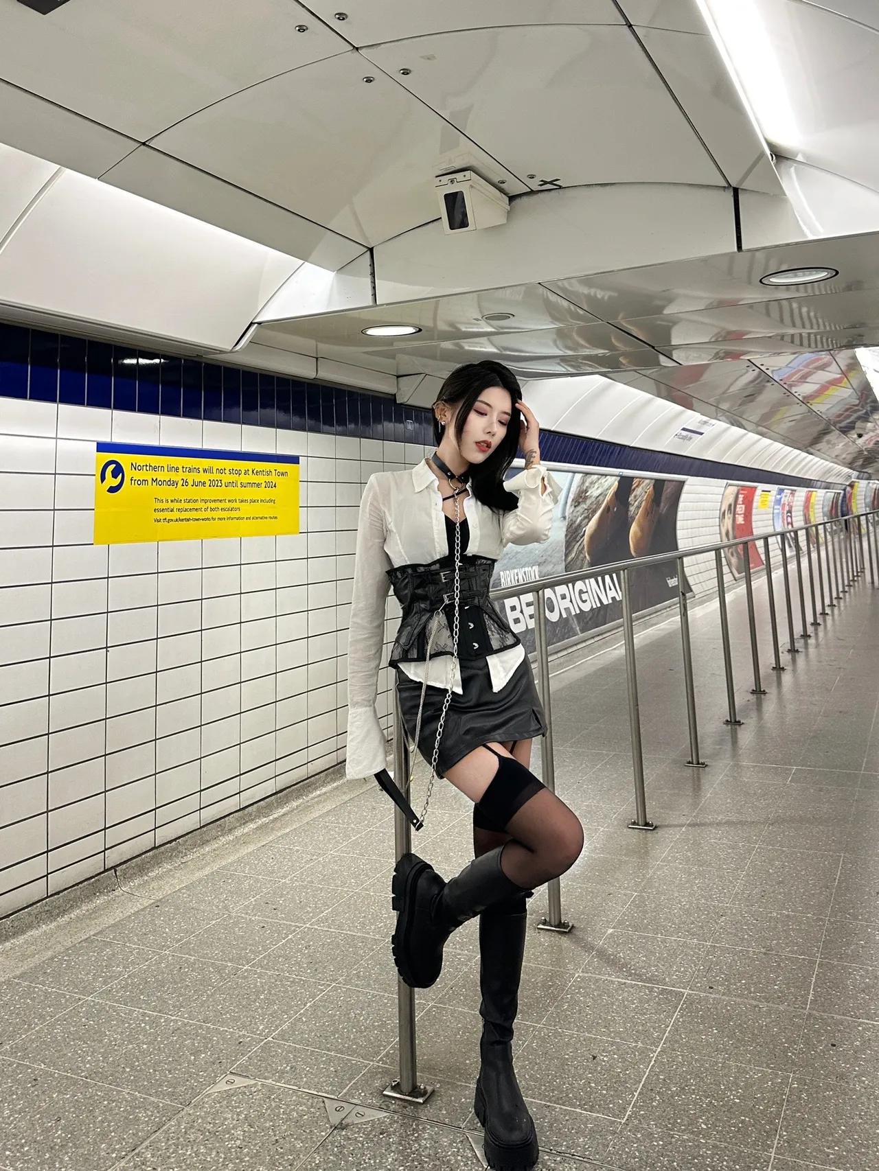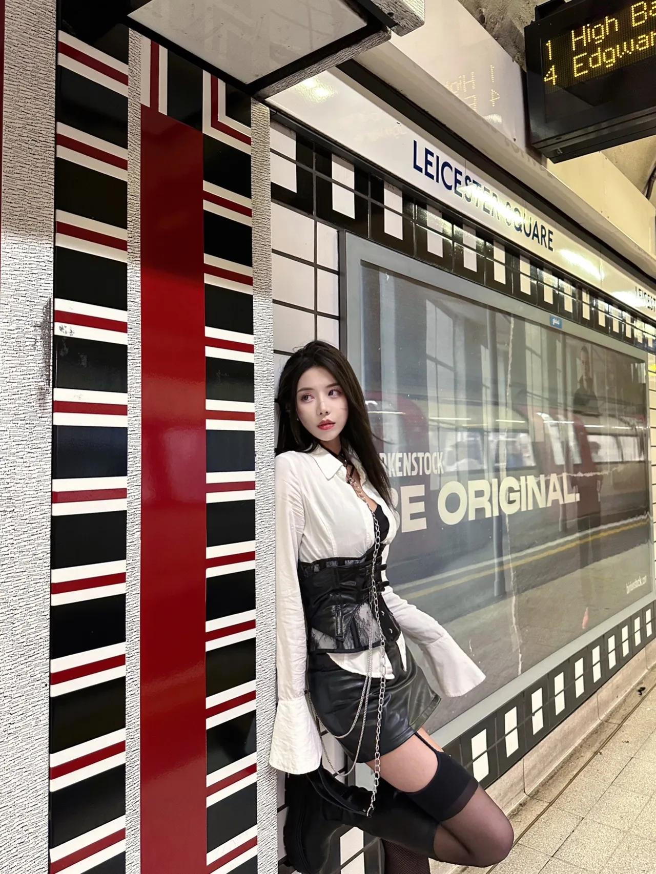 地铁辣妹穿搭|甜酷风直接封神✨ 谁能拒绝在伦敦莱斯特广场地铁站拍一组甜酷大片!白衬衫+束腰+皮裙的组合真的太绝了,自带清冷又叛逆的氛围感,黑丝长靴+链条配饰直接把辣度拉满,又纯又欲谁看了不迷糊! 在复古英伦风的地铁站里,黑白红的经典配色和环境完美融合,每一张都像时尚大片。这种“坏女孩”风真的太适合拍照了,既有衬衫的知性,又有皮裙的飒爽,甜酷平衡得刚刚好,日常出街、约会都能穿,回头率直接爆表!