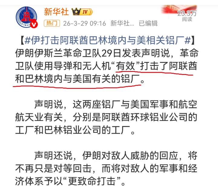 阿联酋这个铝厂被伊朗炸了,整个生产线停了。铝金属溶液都凝固了,整个生产线报废了,必须得重新建。这个生产线是美国用来提炼镓的,这下彻底完蛋了。 先把这事的来龙去脉说清楚。被袭击的不是普通铝厂,是中东最大铝生产商阿联酋环球铝业(EGA)在阿布扎比的塔维拉冶炼厂。 伊朗那边说得很明白,这次导弹和无人机打击,目标就是跟美国军事、航空航天产业挂钩的设施。 3 月 28 号那天袭击一发生,工厂直接断电,核心的电解槽生产线当场 “失控停机”。 这种大型铝电解槽一停就是灭顶之灾。槽里上千度的铝金属溶液没了电力搅拌和加热,短短几小时就彻底凝固在设备里,跟生产线焊成了一整块铁疙瘩。 想修复?根本不可能,只能把整条生产线全部拆掉,重新炼钢、重新组装、重新点火,没有两三年时间根本恢复不了,前期投进去的几十亿美元直接打了水漂。 对美国来说,最致命的是,这条产线不只是炼铝,更是美国布局多年、全球少有的能从铝土矿里大规模提取高纯镓的关键基地。 为啥美国要千里迢迢跑到阿联酋去炼镓?这事得从镓这种金属的特殊性说起。 镓这东西,平时没人注意,但它是半导体工业的 “新粮食”。不管是手机里的射频芯片、5G 基站的核心元件,还是雷达、导弹里的半导体器件,甚至现在最火的氮化镓快充,全都离不开镓。 没有镓,高端芯片造不出来,先进通信设备就是一堆废铁,军工产业直接停摆。 但镓有个要命的特点:它从不单独成矿,全是铝土矿和锌矿加工时的副产品。想炼镓,必须先建大规模的铝冶炼厂,在提炼铝的过程中,从废渣、废液里把镓一点点分离提纯出来。 全球 90% 以上的镓产能,过去几十年一直攥在中国手里。美国早就把镓列为头号战略矿产,可自己国内要么储量少,要么为了保护资源不开采,长期以来只能从中国进口。 这就成了美国的心病。中国一旦收紧镓的出口,美国整个高科技和军工产业链就得断粮。 2023 年中国对镓相关物项实施出口管制后,美国更是急得跳脚。光靠储备撑不了多久,必须找个替代来源。 挑来挑去,美国选中了阿联酋。阿联酋有丰富的铝土矿资源,又跟美国关系铁,还愿意配合美国的战略布局。 于是美国砸了几十亿美元,帮阿联酋环球铝业扩建塔维拉工厂,核心目标就是建一条完整的 “铝矿 — 原铝 — 高纯镓” 产业链。 美国的算盘打得很精:这条产线满产后,能满足美国至少 30% 的镓需求,再加上从其他国家零散进口,就能慢慢摆脱对中国镓的依赖。 前后折腾了快四年,眼看着生产线刚稳定量产,结果伊朗一枚导弹,全给炸没了。 现在的局面对美国来说,简直是晴天霹雳。首先,镓的替代来源彻底断了。阿联酋这条线一废,全球除了中国,没有任何一个国家有这么大规模的镓提纯产能。 其他国家要么是小作坊式生产,要么纯度不够,根本满足不了美国芯片和军工的高标准需求。 其次,损失没法补救。想在阿联酋重建?先不说两三年的时间窗口等不等得起,现在中东局势这么乱,霍尔木兹海峡都快封了,原材料运不进来,产品运不出去。 就算建好了,下次再被炸怎么办?想换个地方建?没个五六年根本建不起来,而且镓生产必须绑定大规模铝厂,全球符合条件、又愿意跟美国合作的地方,屈指可数。 阿联酋的铝厂没了,美国的镓梦碎了,而全球高科技产业的供应链格局,又因为这一次袭击,重新回到了中国掌握关键资源的原点。