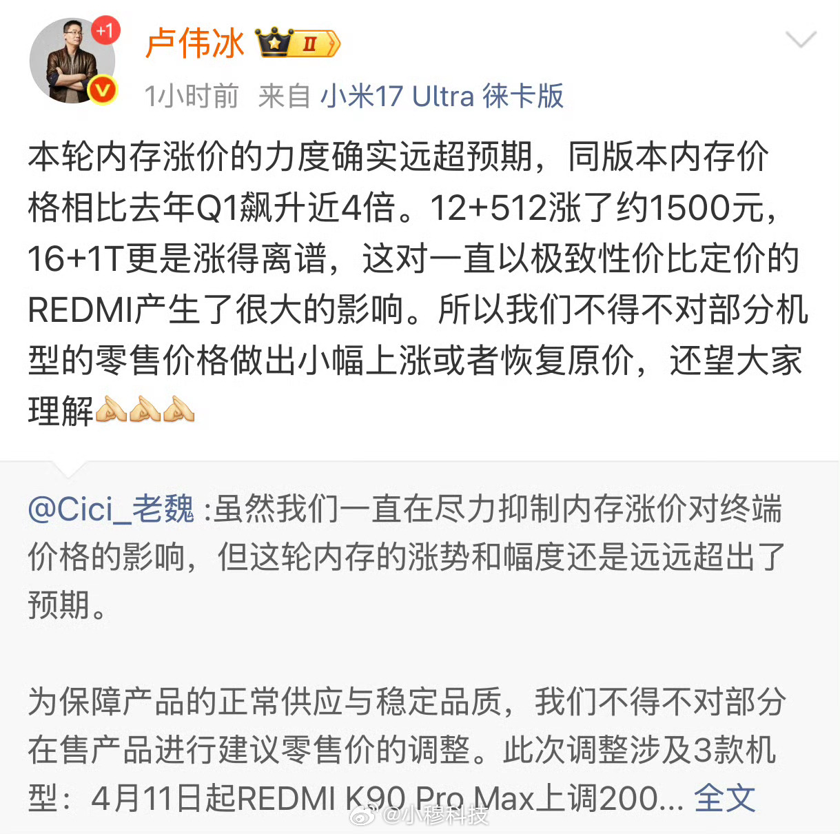 卢伟冰:内存价格同比暴涨4倍12+512G版本涨价1500,16+1T涨价甚至接近2000