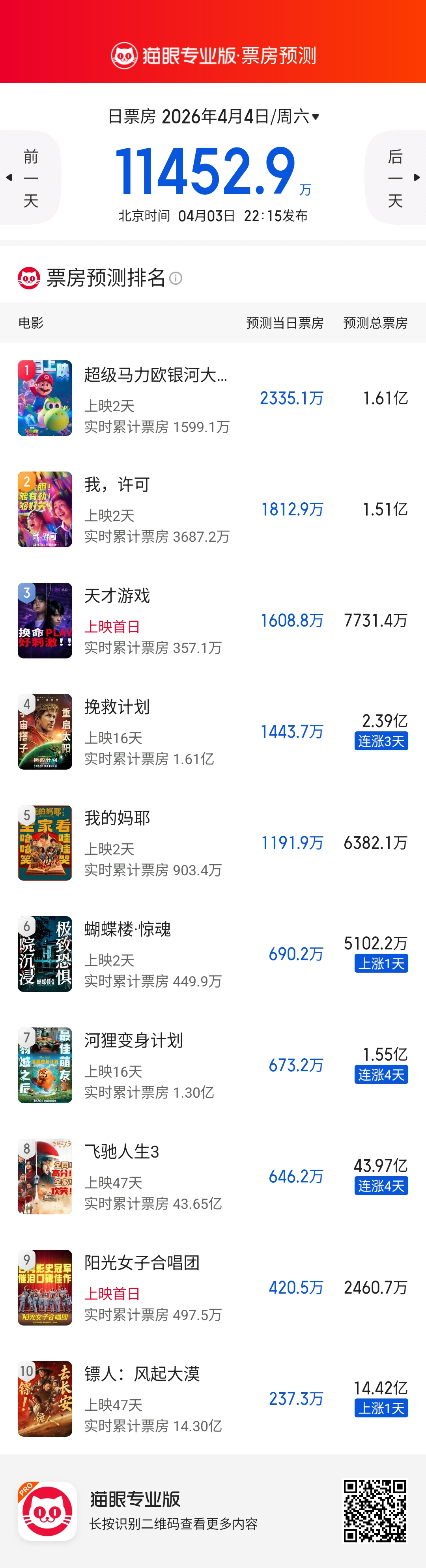 清明档现在已经变成多一天的普通周末了,没有啥档期加成。记得去年的清明档前夕也特别凉,等到了休息日有家庭观众入场还不至于太低。今年表现应该也是类似,可能略低于去年。