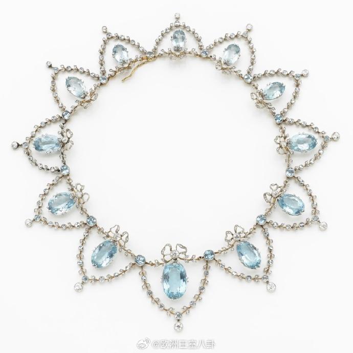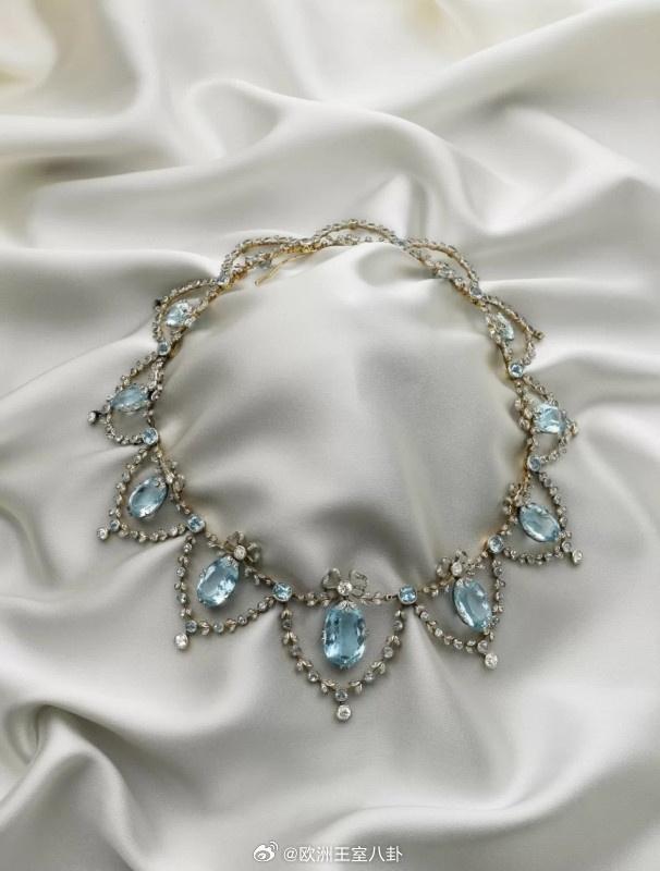 曾属于普鲁士公主维多利亚-露易丝(小七,因为她是家中老幺,上头有6个哥哥)的海蓝宝项链,是1913年她嫁给汉诺威继承人恩斯特·奥古斯特结婚时的结婚礼物。送礼方为末代沙皇尼古拉二世夫妇,项链制作方大概率为法贝热 那会德国和俄国的君主制还合法,小七的婚礼据说办得颇为隆重 项链在1996年和2016年各卖一次,第二次估价为5.5-8.5w欧。小七有5个儿女孙辈更多,不造谁卖的。俄国珠宝设计真没法说,可惜没留下佩戴图,拍卖会也没找人试戴