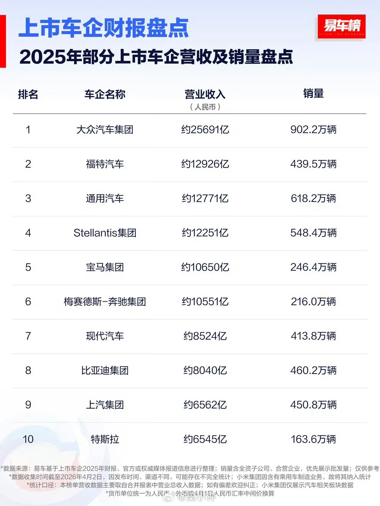 2025年部分上市车企营收及销量盘点🏅大众,约25691亿🥈福特,约12969亿🥉通用,约12771亿