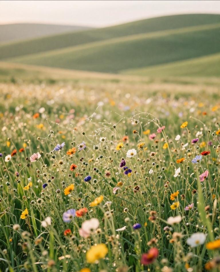 那是怎样的一种盛放啊。紫色的马鞭草连成一片温柔的雾霭,在午后的微风里轻轻摇曳;金黄的向日葵高昂着头,追逐着太阳的轨迹;粉白的格桑花星星点点,散落在田埂与小路旁,像是谁不经意撒下的珍珠。色彩并不刺眼,而是交融成一种和谐的、流动的光晕,从脚下一直铺展到远山的轮廓线。