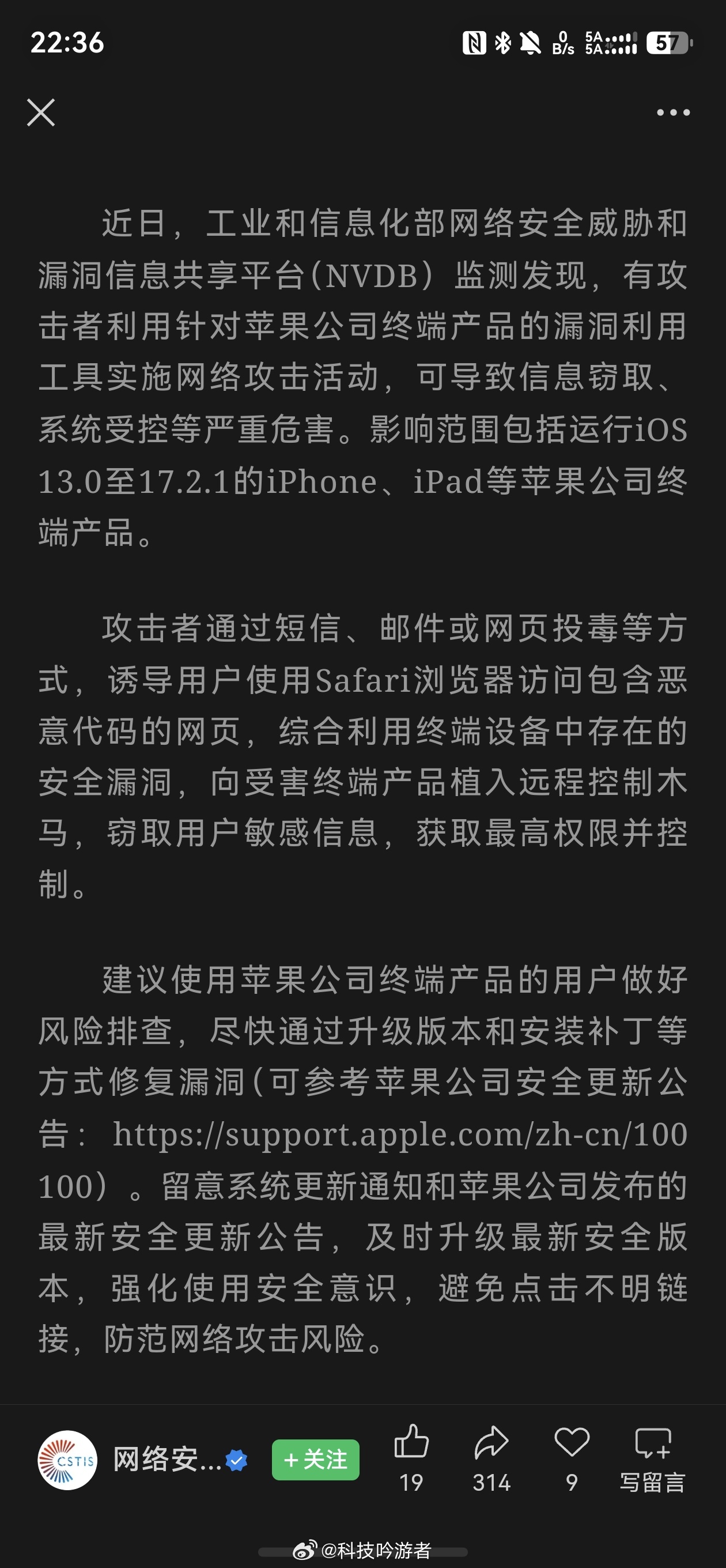 工信部监测到iOS 13.0至17.2.1存在高危漏洞,可致设备被控、信息泄露。苹果用户注意一下自己系统版本,升级系统至最新版本,并警惕不明链接。